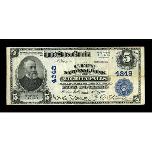 <B>Wichita Falls, TX</B></I> - $5 1902 Plain Back Fr. 600 <B>The City NB</B></I> Ch. # 4248<BR> This $5 exhibits even circulation and sound edges. The signatures are engraved. <B>Very Fine.</B></I> <BR><BR><b>Shipping:</b> Coins & Currency (<a target="_blank" href="http://www.heritageauctions.com/common/shipping.php">view shipping information</a>)