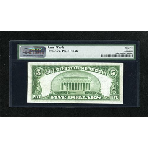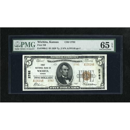 <B>Wichita, KS</B></I> - $5 1929 Ty. 2 <B>First NB</B></I> Ch. # 2782<BR>This perfectly executed note boasts original paper waves and deep embossing. <B>PMG Gem Uncirculated 65 EPQ.</B></I><BR><BR><b>Shipping:</b> Coins & Currency (<a target="_blank" href="http://www.heritageauctions.com/common/shipping.php">view shipping information</a>)