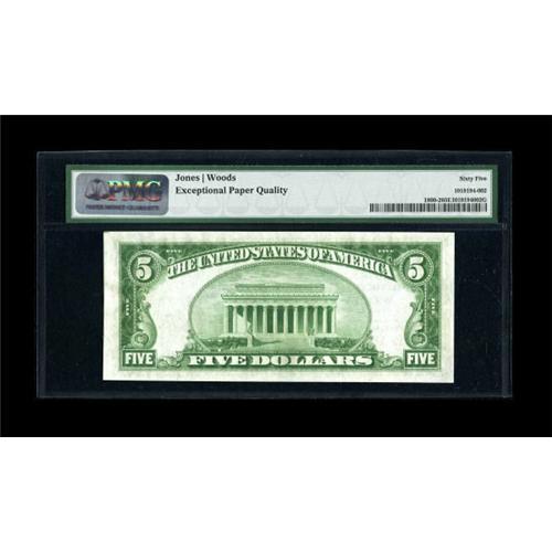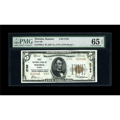 <B>Wichita, KS</B></I> - $5 1929 Ty. 2 <B>First NB</B></I> Ch. # 2782<BR> Bold embossing and natural paper ripple are highlights of this darkly inked $5. <B>PMG Gem Uncirculated 65 EPQ</B></I>.<BR><I>From The J.S. Weber Collection.</B></I><BR><BR><b>Shipping:</b> Coins & Currency (<a target="_blank" href="http://www.heritageauctions.com/common/shipping.php">view shipping information</a>)