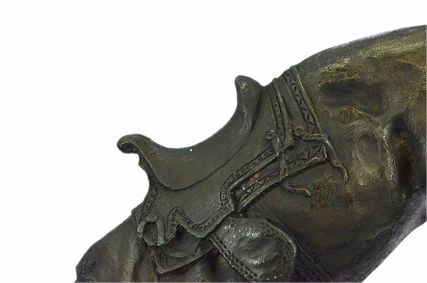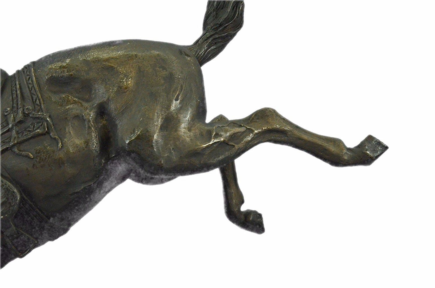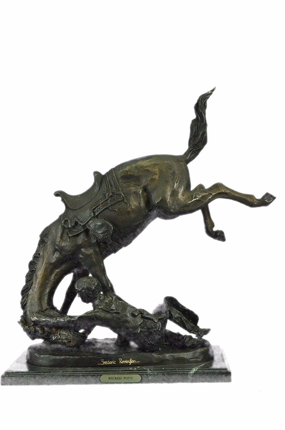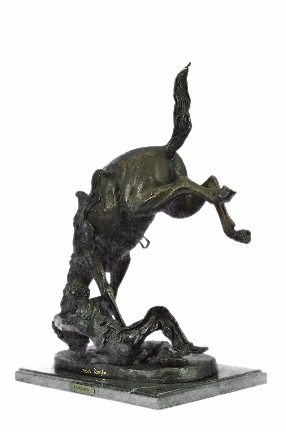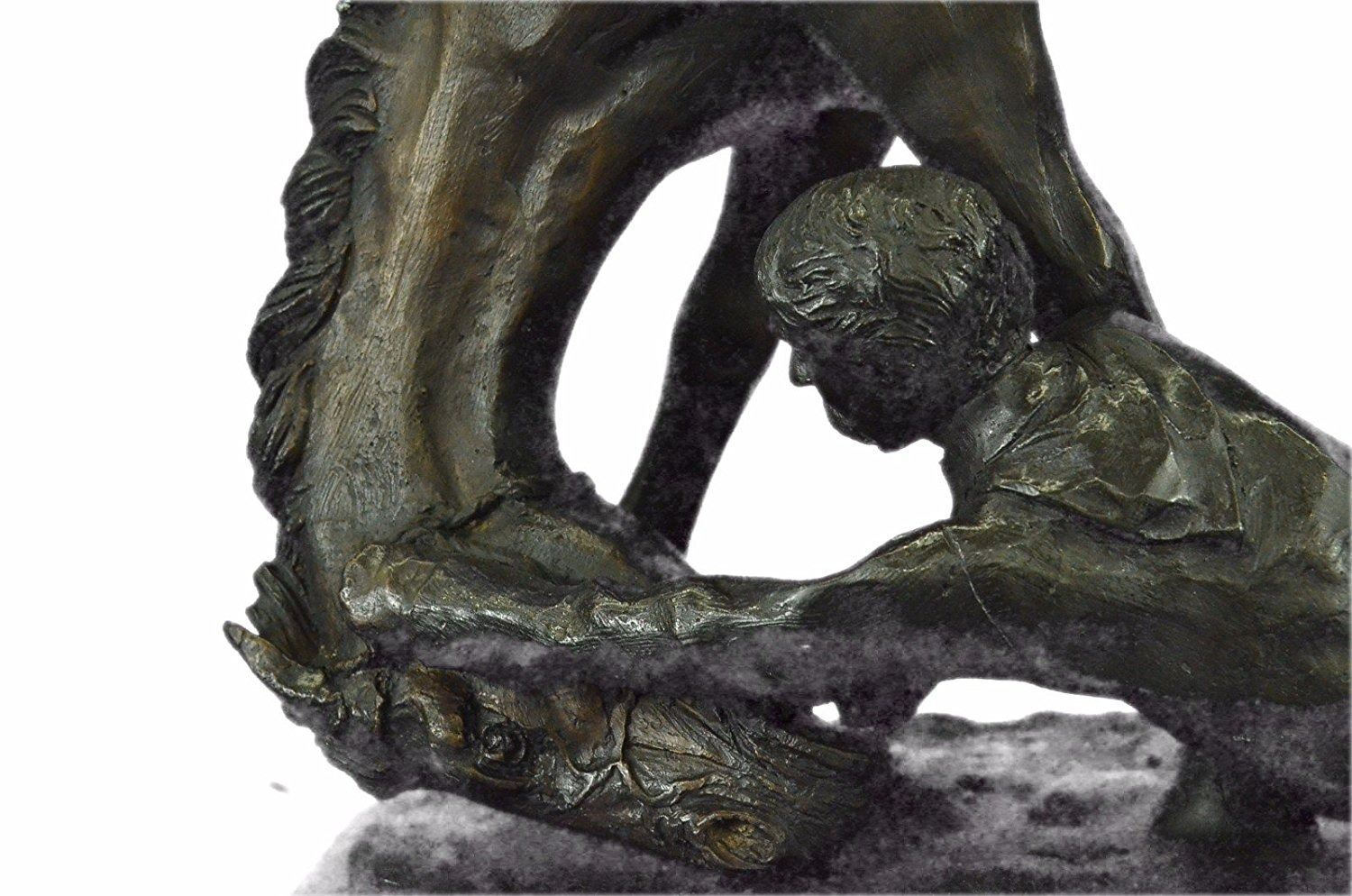 This sculpture of a man and his rebellious horse is amazing. The details on this statue is astonishing from the man on the floor, after his fall. The horse isstill being a handfull and his owner trying to control him is barely working. Although he is trying toman handlehim by forcing his head down on the floor, the horse is not giving up and he is kicking his lower body high up. While he keeps his legs in the air the man is laying down beneath him trying to make sure he does not get hurt. This beautiful sculpture was cast using the ancient old Lost Wax Method stained in brown patina finish for preservation. 100% handmade and 100% bronze, mounted atop a black marble base. Bronze Dimensions with Marble Base: Height 24 X Width 23 inches. Weight: 42 LBS. Inventory: 5457058M15745