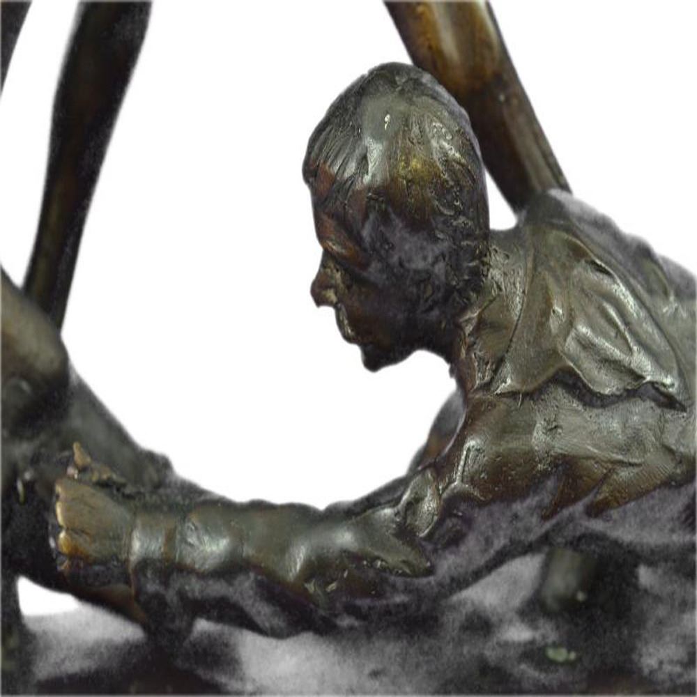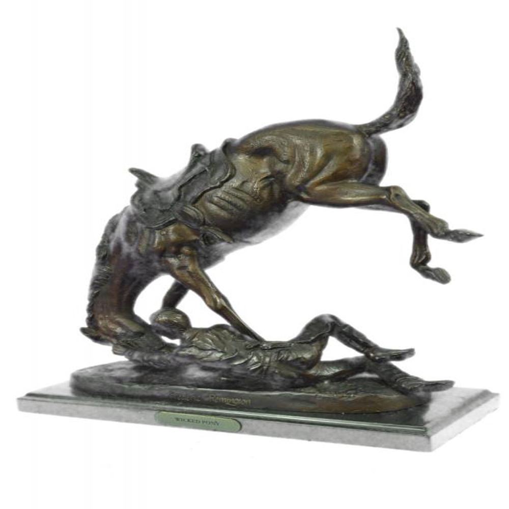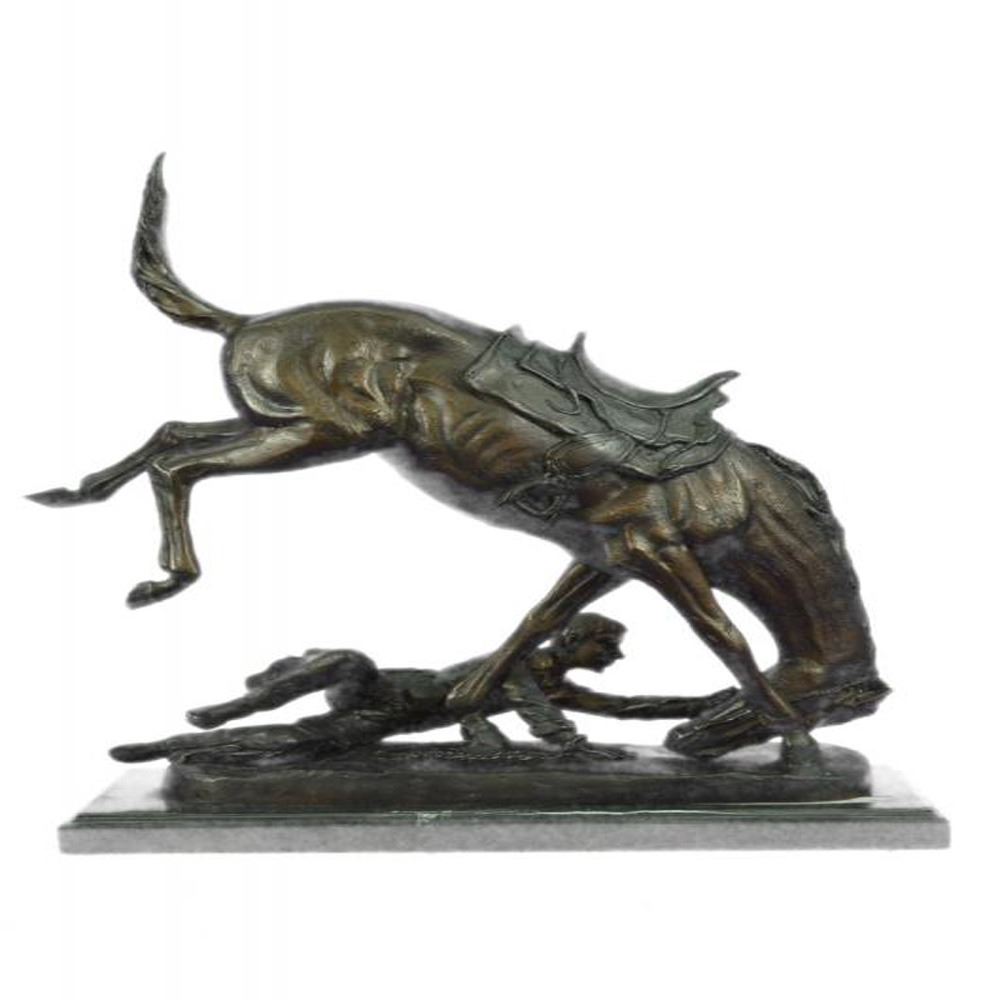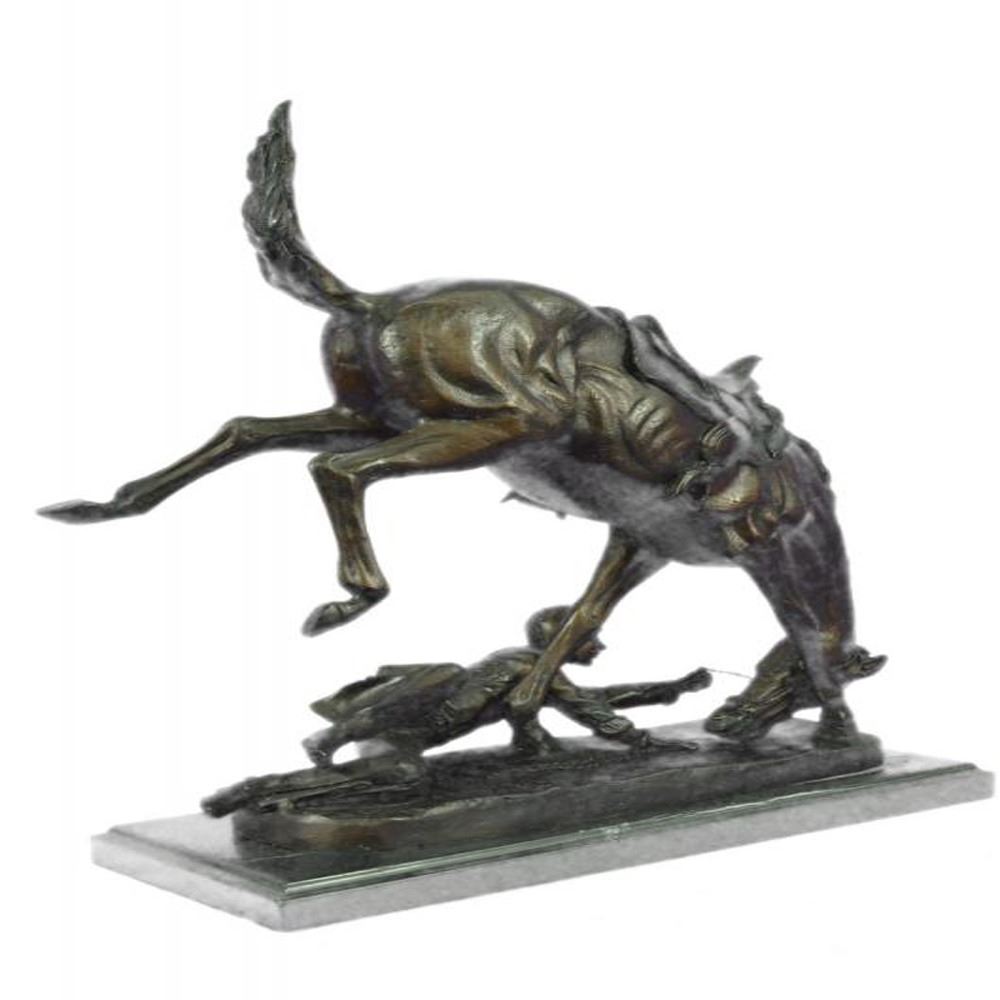 A cowboy is bucked and dragged by his uncontrollable bronco. He attempts to hold on as long as he can but the rugged earth beneath him tears at his clothes. He is dressed in a shirt, chaps, and boots. The horse saddle stays secure as he kicks his hind legs high in the air. Though the cowboy continues to hold onto the reins around its head, the horse fights. It is a battle of the wills, but either way, the cowboy will get back on his feet, dust off and ride again. This brown patina Sculpture was cast using the Lost Wax Method and mounted on a marble base. Dimensions: Height 20 X Width 22 inches. Weight: 23 LBS.