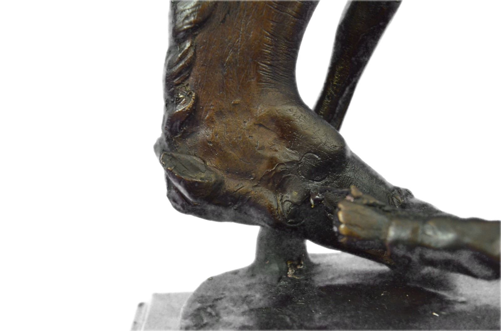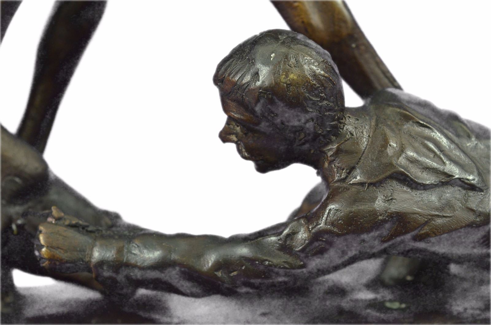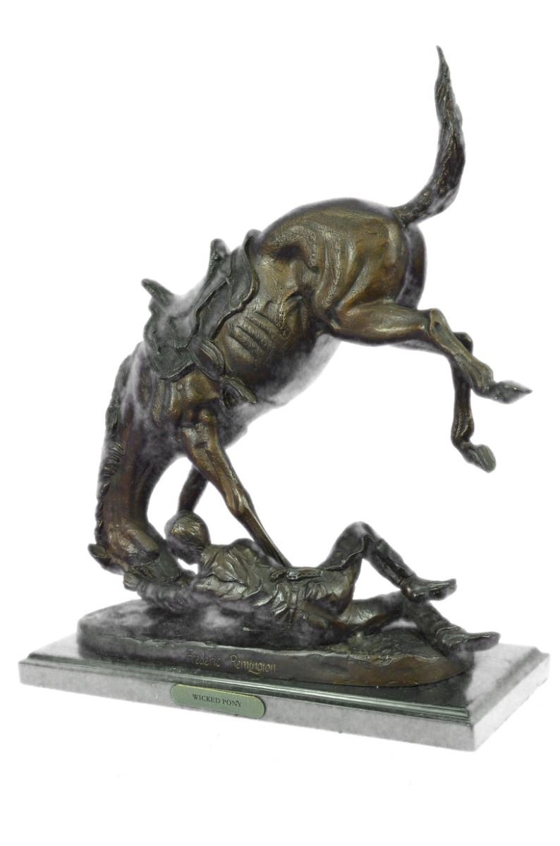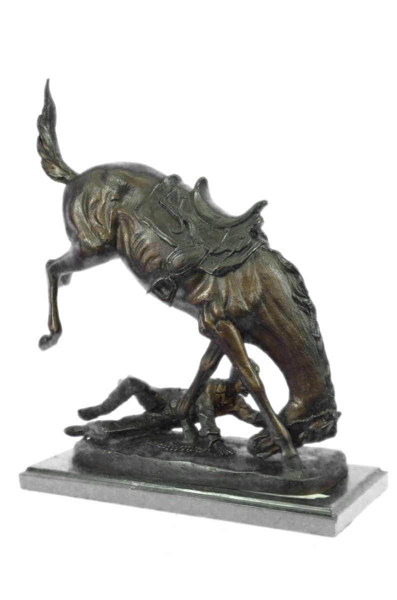 A Cowboy Is Bucked And Dragged By His Uncontrollable Bronco. He Attempts To Hold On As Long As He Can But The Rugged Earth Beneath Him Tears At His Clothes. He Is Dressed In A Shirt,Chaps And Boots. The Horse'S Saddle Stays Secure As He Kicks His Hind Legs High In The Air. Though The Cowboy Continues To Hold Onto The Reins Around Its Head, The Horse Fights. It Is A Battle Of The Wills, But Either Way The Cowboy Will Get Back On His Feet, Dust Off And Ride Again. 100% Bronze And Handmade, This Brown Patina Sculpture Was Cast Using The Lost Wax Method And Mounted On A Black Marble Base. Bronze Dimensions With Marble Base: Height 20 X Width 22 inches. Weight: 23 Lbs. Please Note: This is a reproduced bronze sculpture from the original molded and signed. This featured bronze sculpture is a recast after the original, and has been done recently. This 100% bronze sculpture is an abstract piece certain to be a conversation piece.