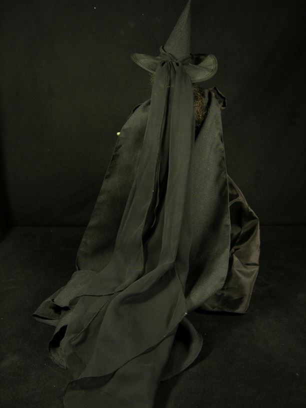 Special figure from the Franklin Mint depicting Margaret Hamilton as the Wicked Witch of the West, dressed in a black cloth clostume with removable hat and black sheer pieces originating from the hat and forming a cape-like shroud. Face and hands are porcelain, painted green. Includes stand. (20x8x8)