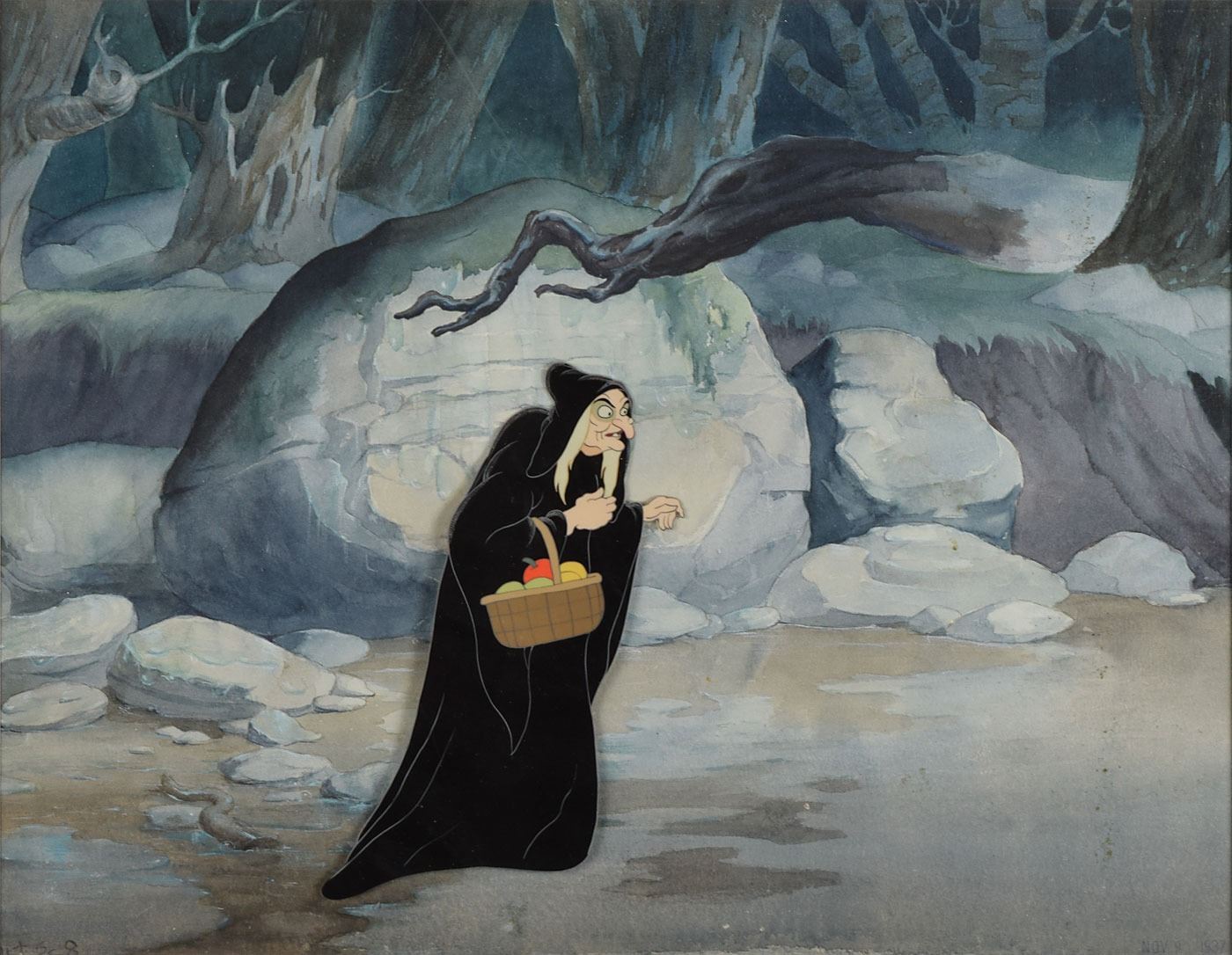 (Walt Disney Studios, 1937) Original production cel and production background featuring the Wicked Witch from Snow White and the Seven Dwarfs, showing the film's antagonist holding her basket with the poison apple inside. The cel is trimmed to image and placed on a hand-painted Snow White production background, stamp-dated in the lower right corner, "Nov 9 1937." Character image measures 4.25 x 6.5, with a mat opening of 14.75 x 11.5. Framed to an overall size of 23.5 x 20. In fine condition. A super rare, amazing set-up from this classic Disney tale.