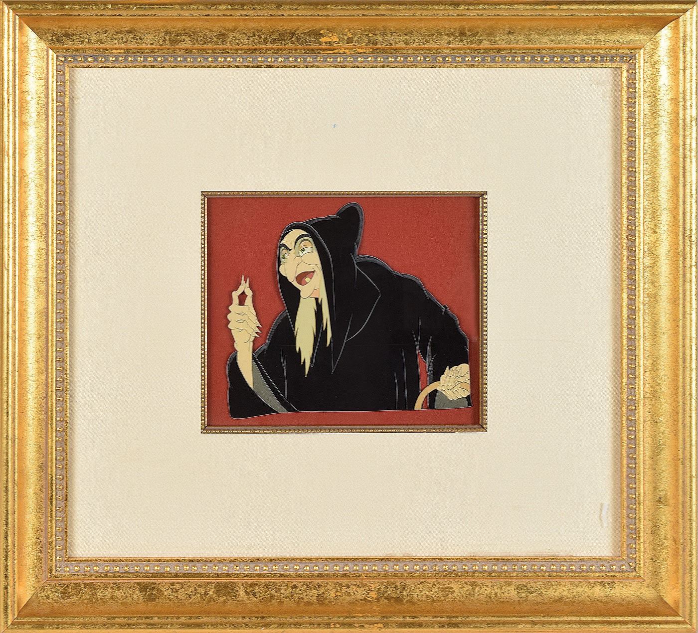 (Walt Disney Studios, 1937) Desirable original production cel featuring the Wicked Witch from Snow White and the Seven Dwarfs, showing Snow White's evil antagonist with her warty thumb and forefinger raised; in her other hand is the handle of the basket in which she carries the poison apple. Image measures 6.5 x 5.75, with a mat opening of 7.5 x 6.25. Framed to an overall size of 19 x 17.5. In fine condition.