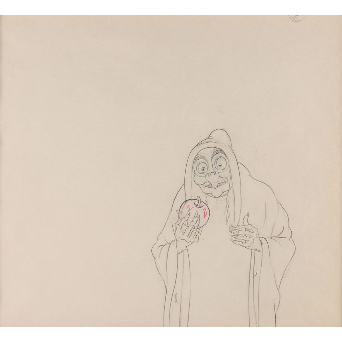 (Walt Disney Studios, 1937) Original production drawing featuring the Wicked Witch from Snow White and the Seven Dwarfs, showing her with the famous poison apple. Accomplished in graphite and colored pencil on animation paper. Image measures 4 x 5.5, with a mat opening of 9.75 x 8.75. This piece is also framed to an overall size of 19.5 x 18.75. In fine condition. A wonderful production sketch of the witch and apple that is central to the story’s plot.