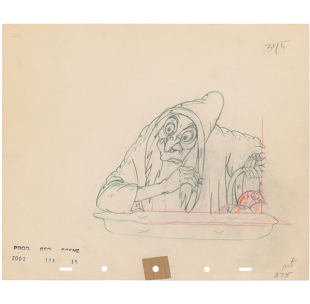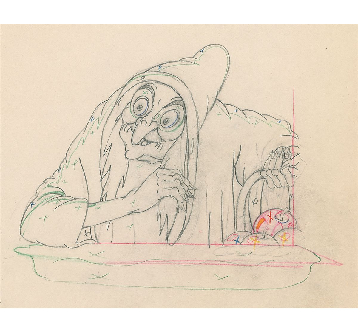 (Walt Disney Studios, 1937) Original production drawing featuring Wicked Witch from Snow White and the Seven Dwarfs. Accomplished in graphite and colored pencil on untrimmed 12 x 10 animation paper. Image measures 6.5 x 5.75 and shows the Wicked Witch peering into the window of Snow White’s cottage about to offer the poisoned apple. In fine condition. A wonderful production sketch of the witch and apple central to the memorable story’s plot.