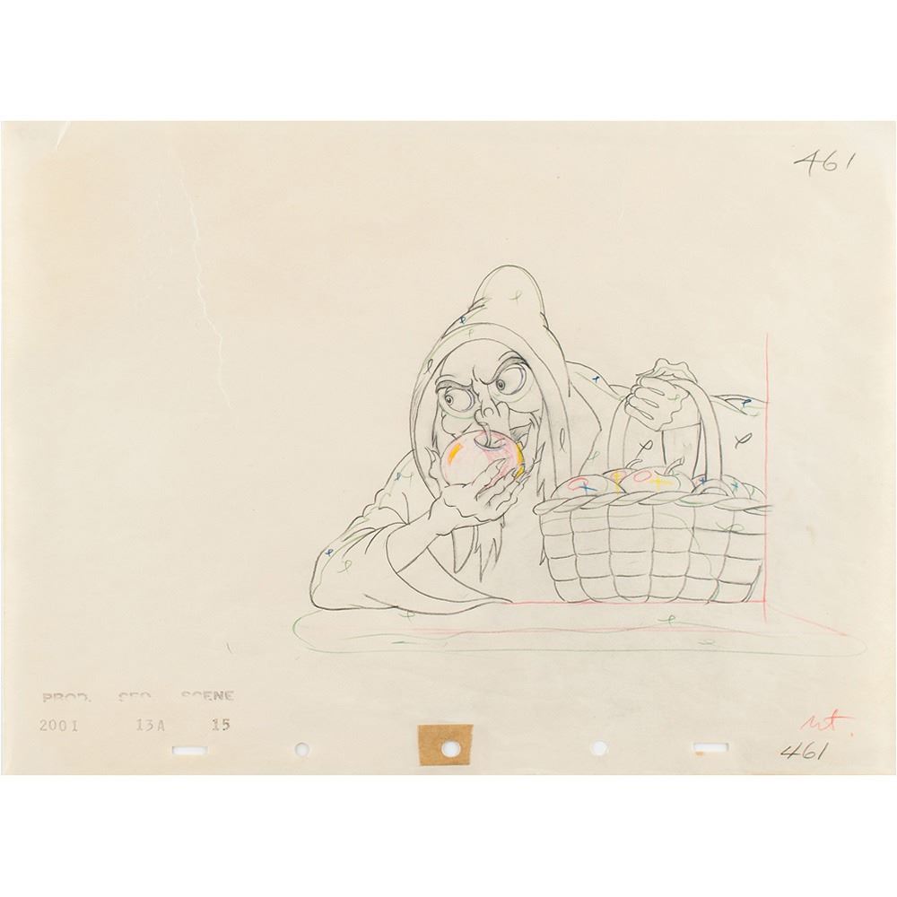 (Walt Disney Studios, 1937) Significant original production drawing featuring the Wicked Witch from Snow White and the Seven Dwarfs, showing her holding her basket of poison apples. Accomplished in graphite and colored pencil on untrimmed 12 x 10 animation paper, stamped in the lower left, "Prod. 2001, Seq. 13A, Scene 15," and marked "461" in two corners. Image measures 6.25 x 5.25. In fine condition, with some wrinkling to left side.