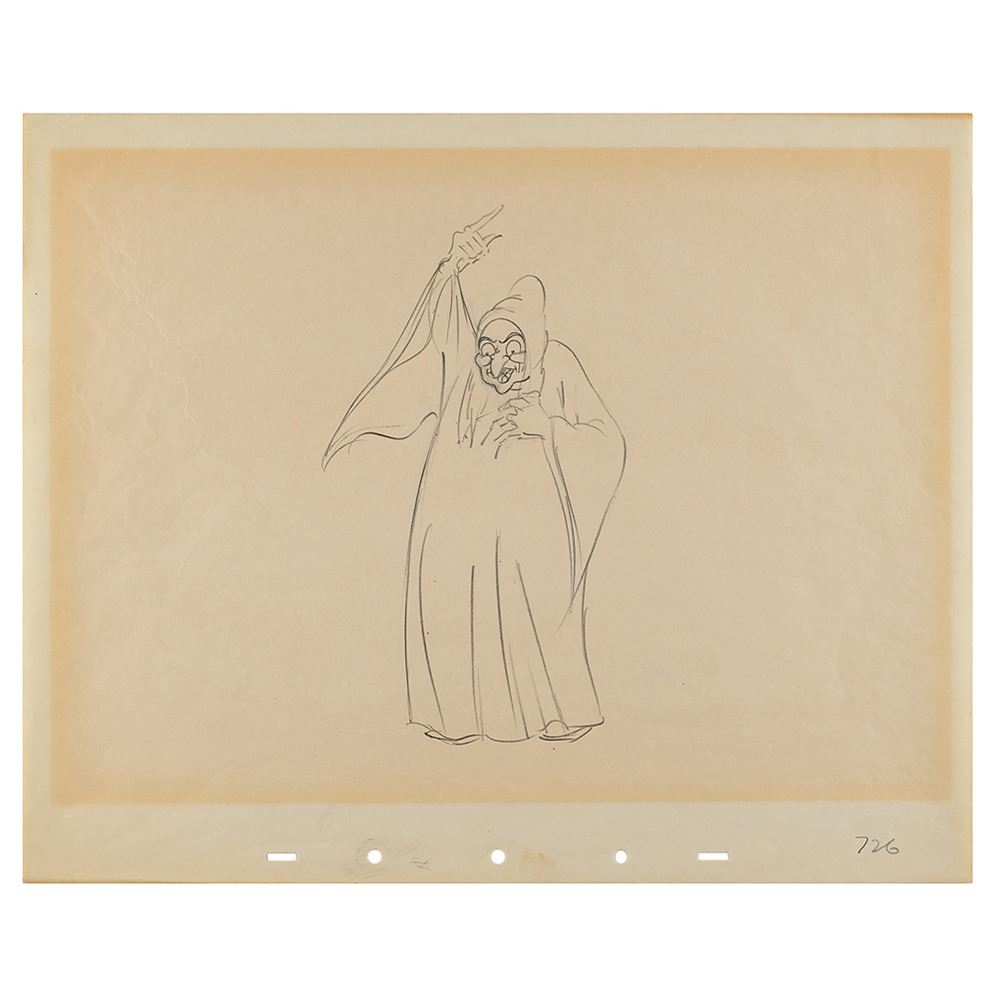 (Walt Disney Studios, 1937) Original rough production drawing featuring the Wicked Witch from Snow White and the Seven Dwarfs, showing her pointing her evil forefinger into the air. Accomplished in graphite on untrimmed 15.5 x 12.5 animation paper, marked "726" in the lower corner. Image measures 5 x 9. In fine condition, with a block of uniform toning from prior display. A great full-figure pose of this classic Disney villain.
