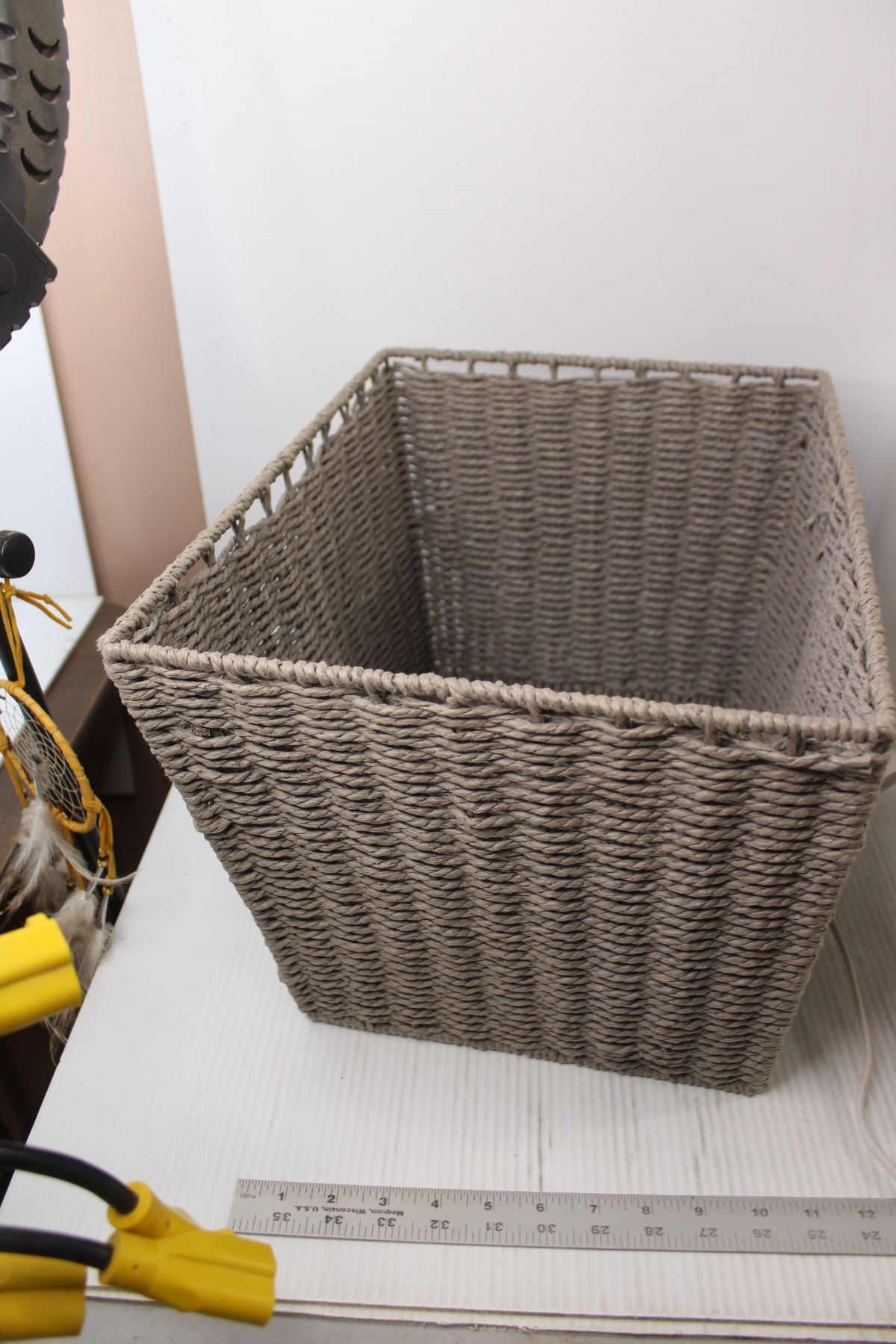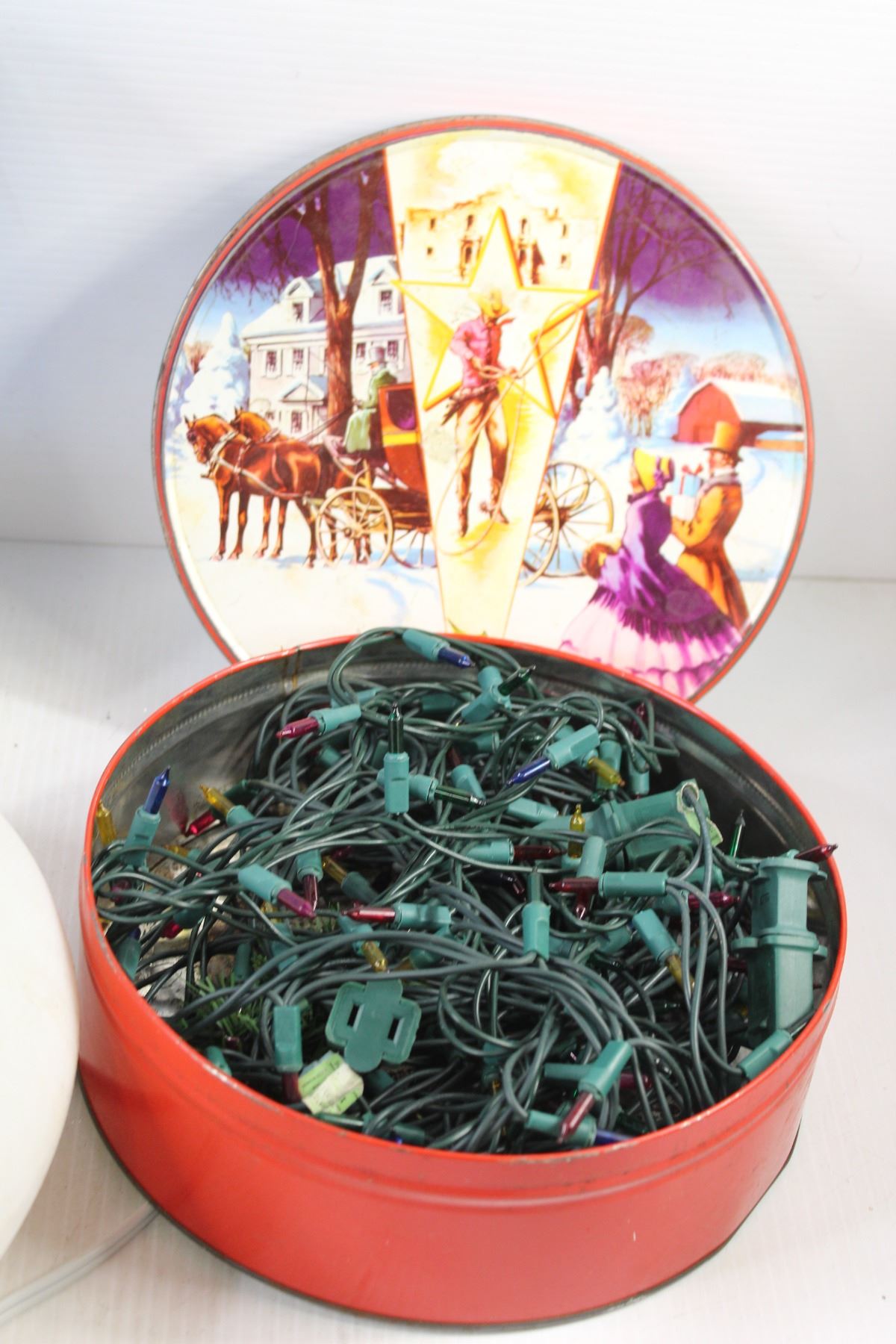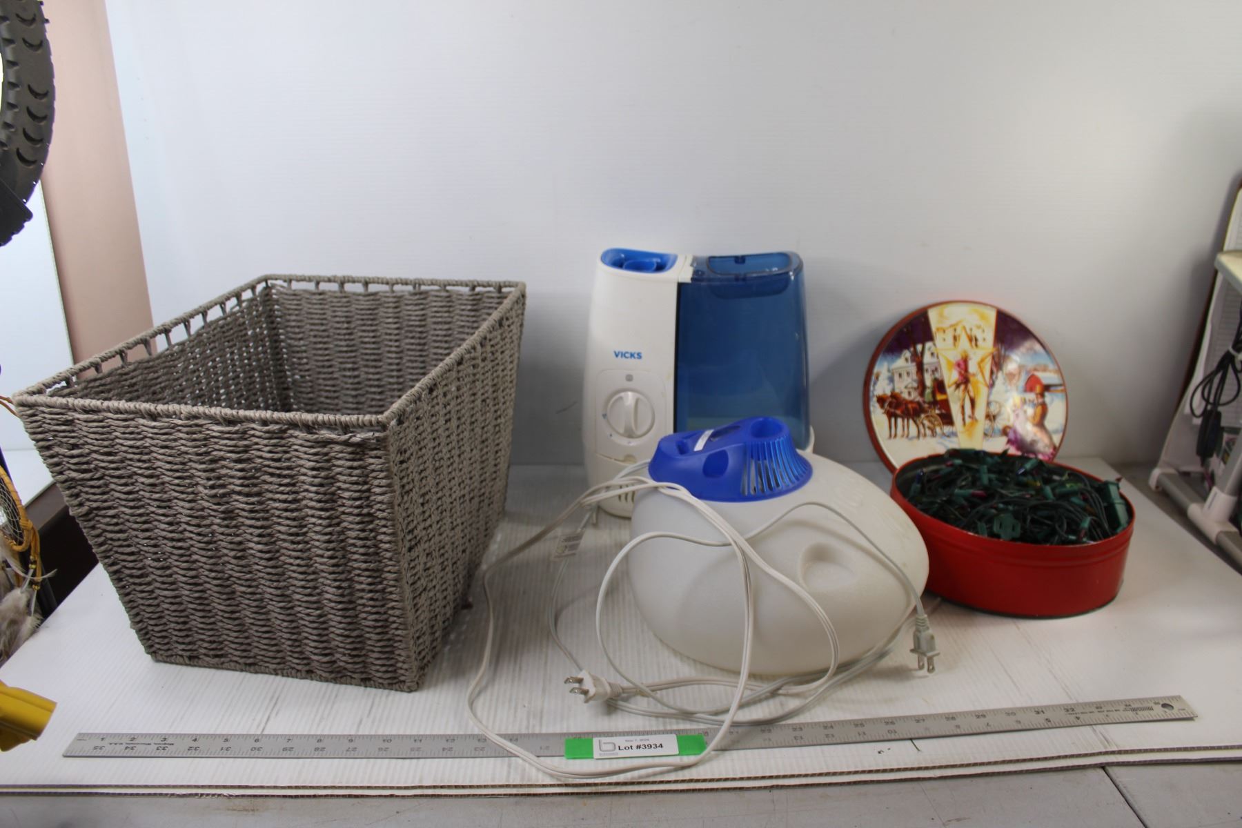 Wicker Basket, (2) Vicks Humidifiers - Tested Tall One Powers On Other One Does Not, Christmas Tin, Christmas Lights - Tested Powers On