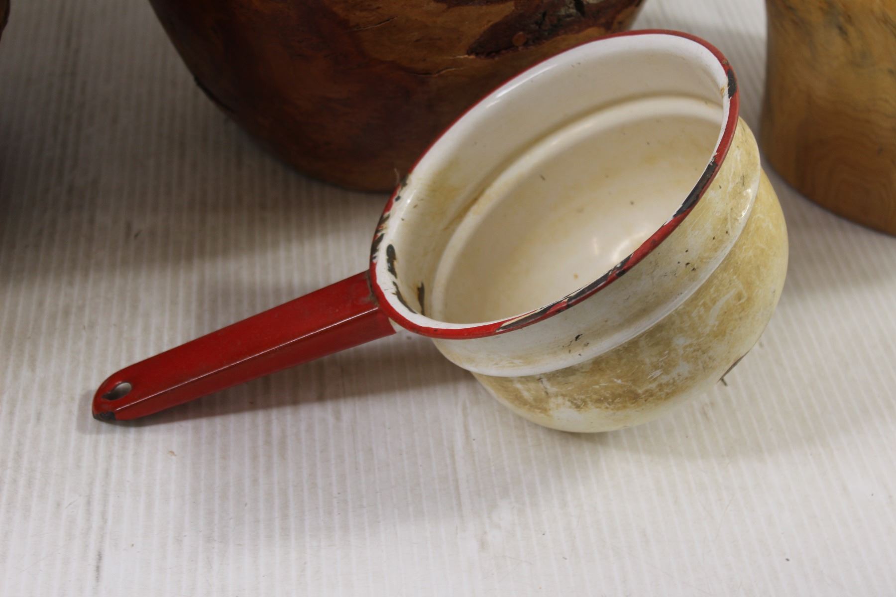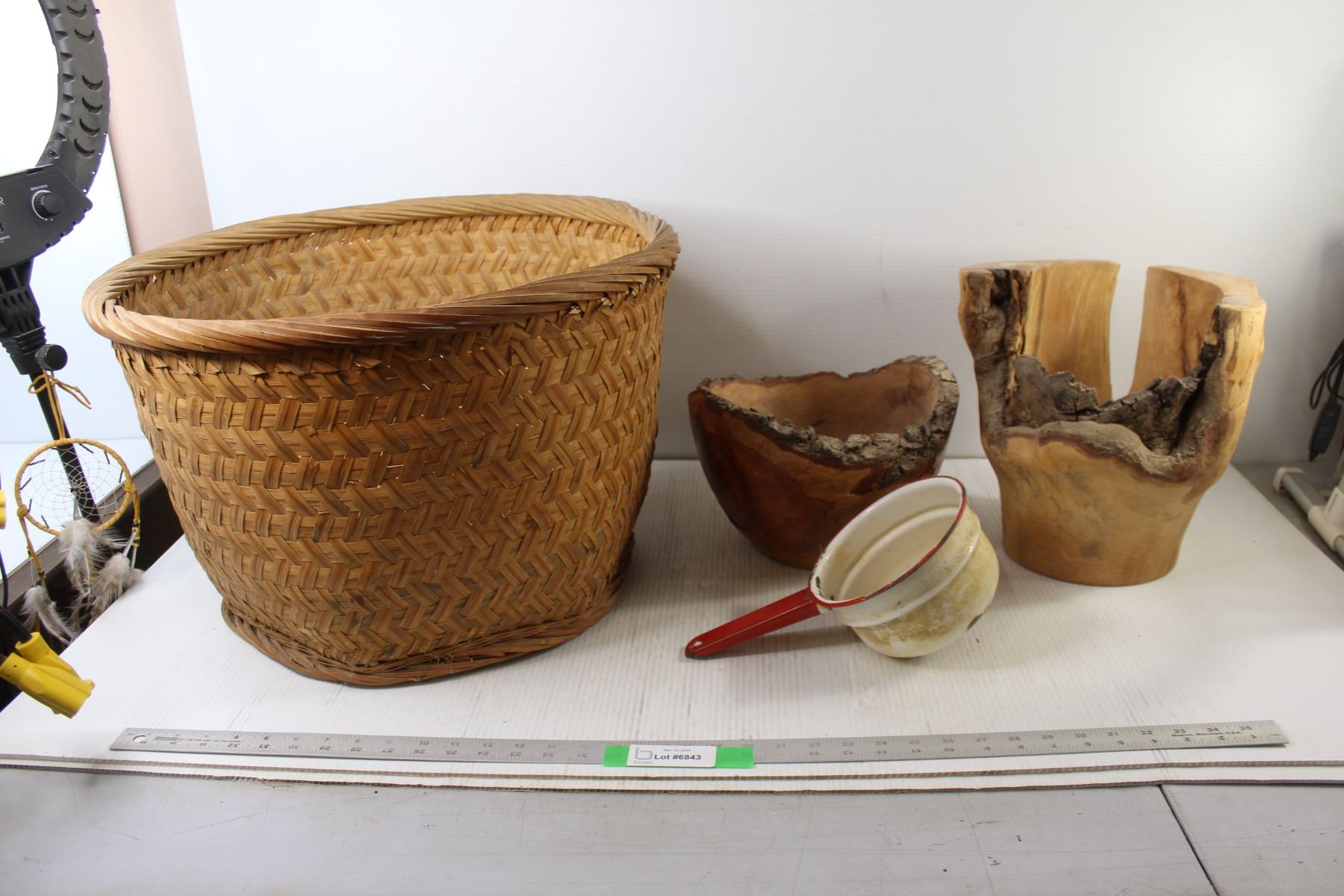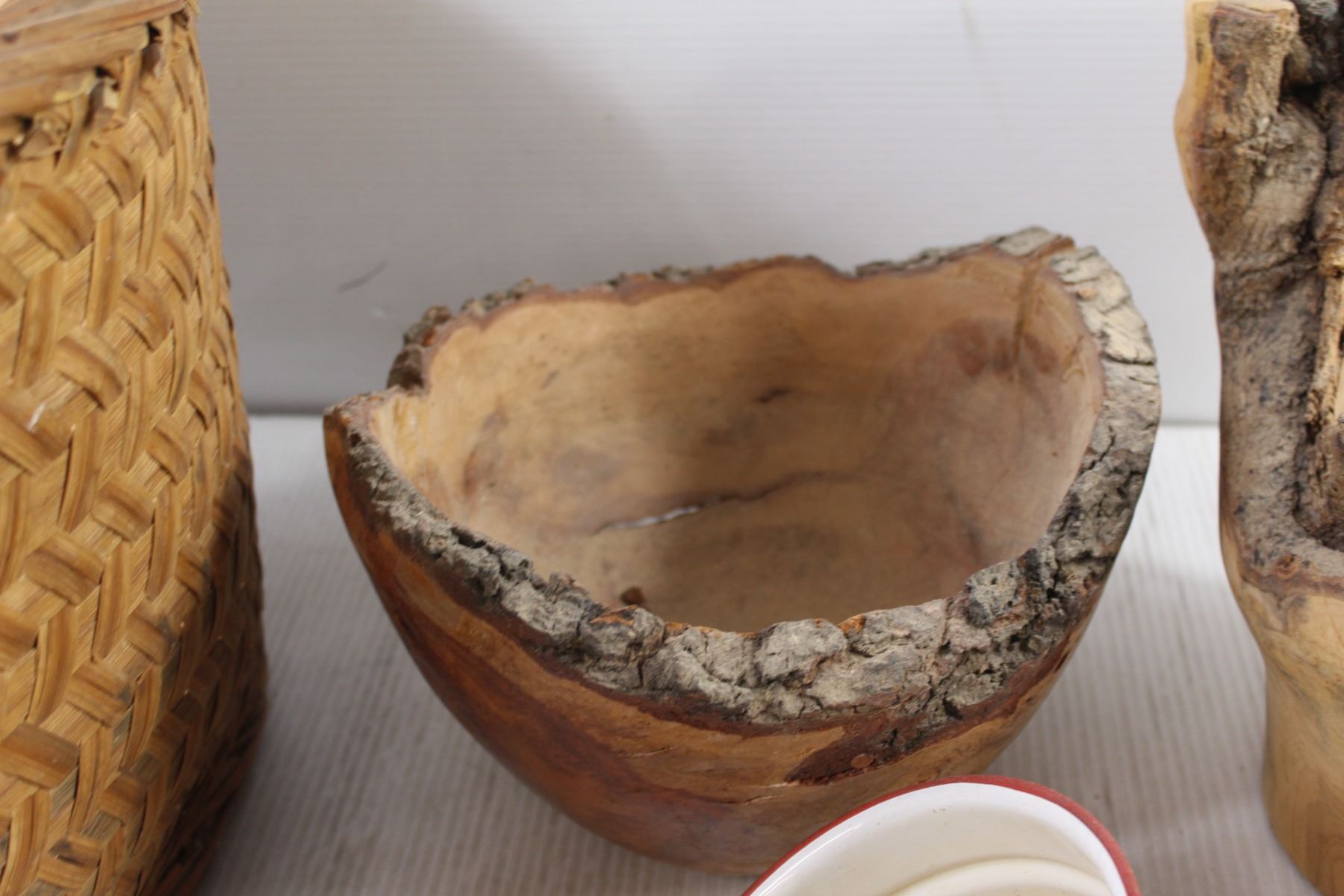 * Wicker Basket, Enamel Pot, (2) Wooden Carvings