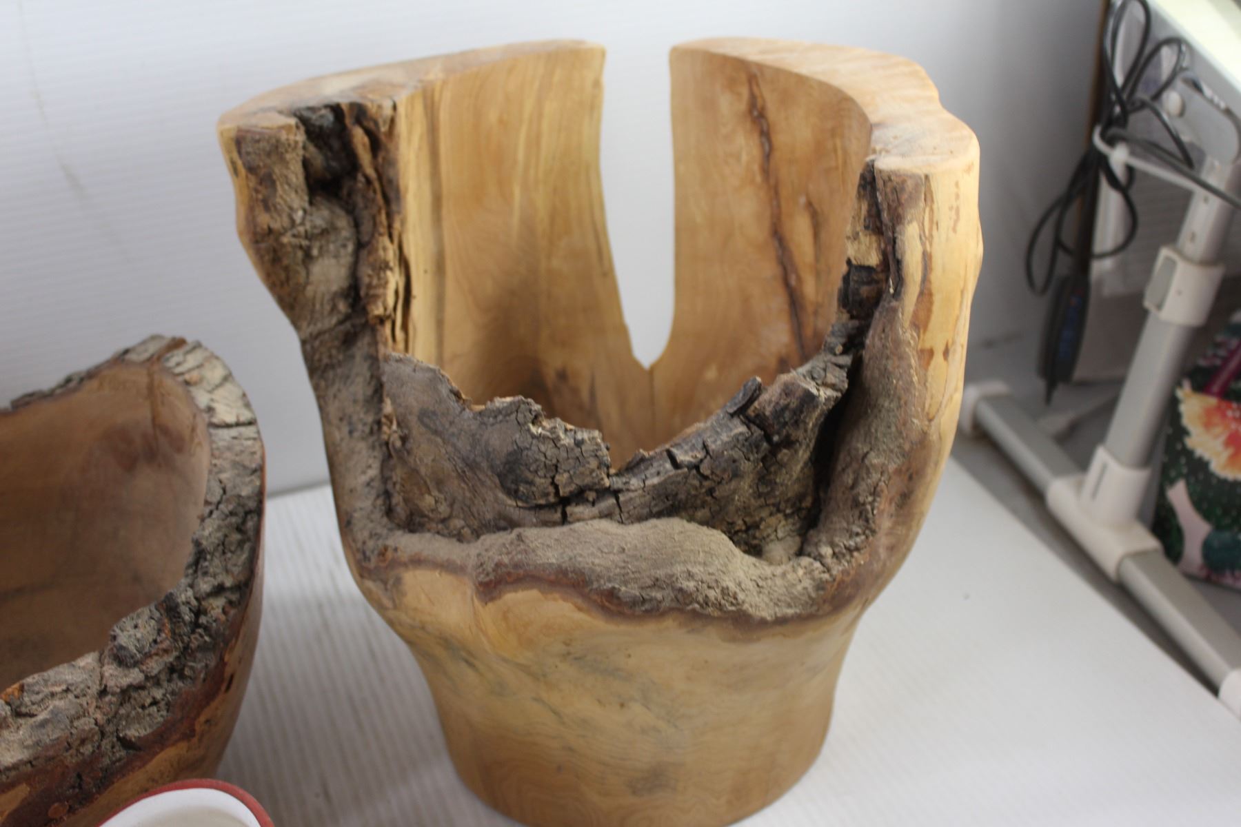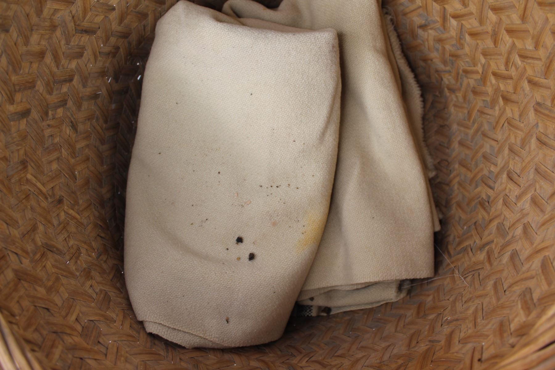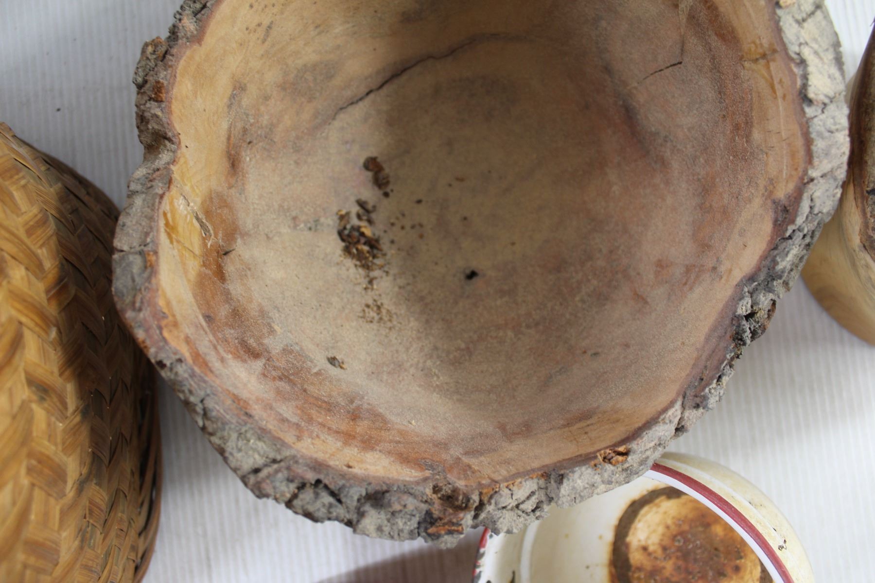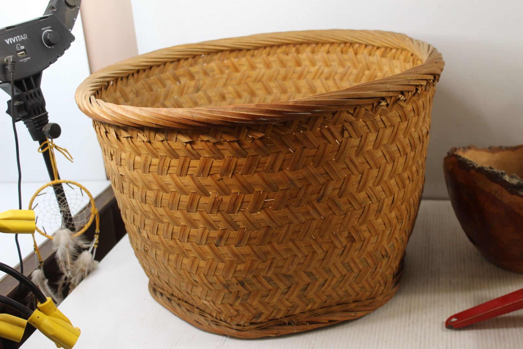* Wicker Basket, Enamel Pot, (2) Wooden Carvings