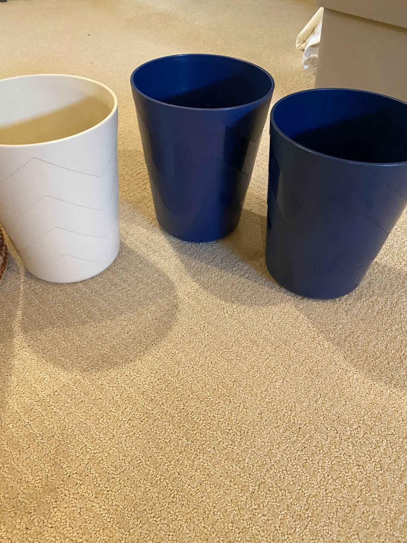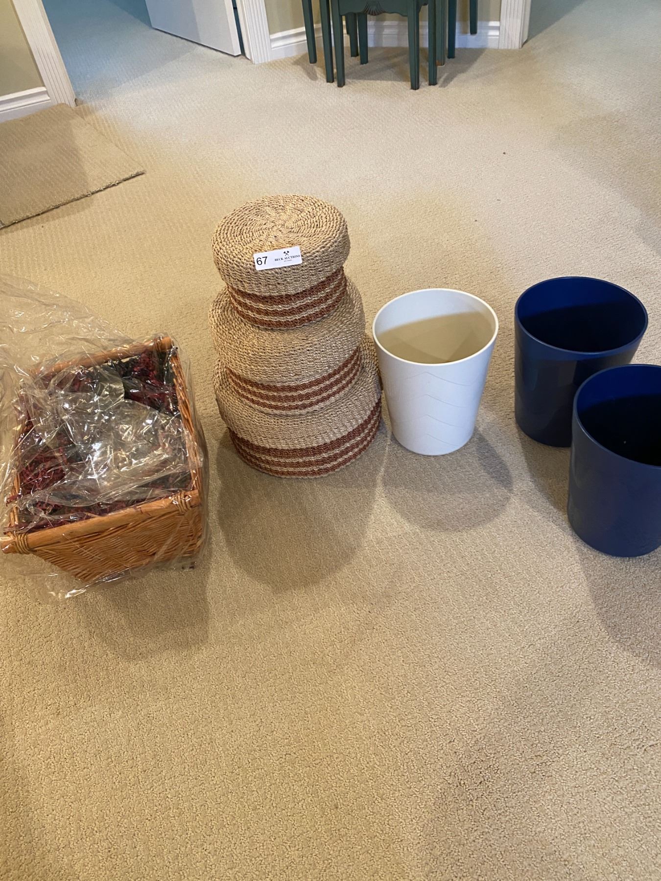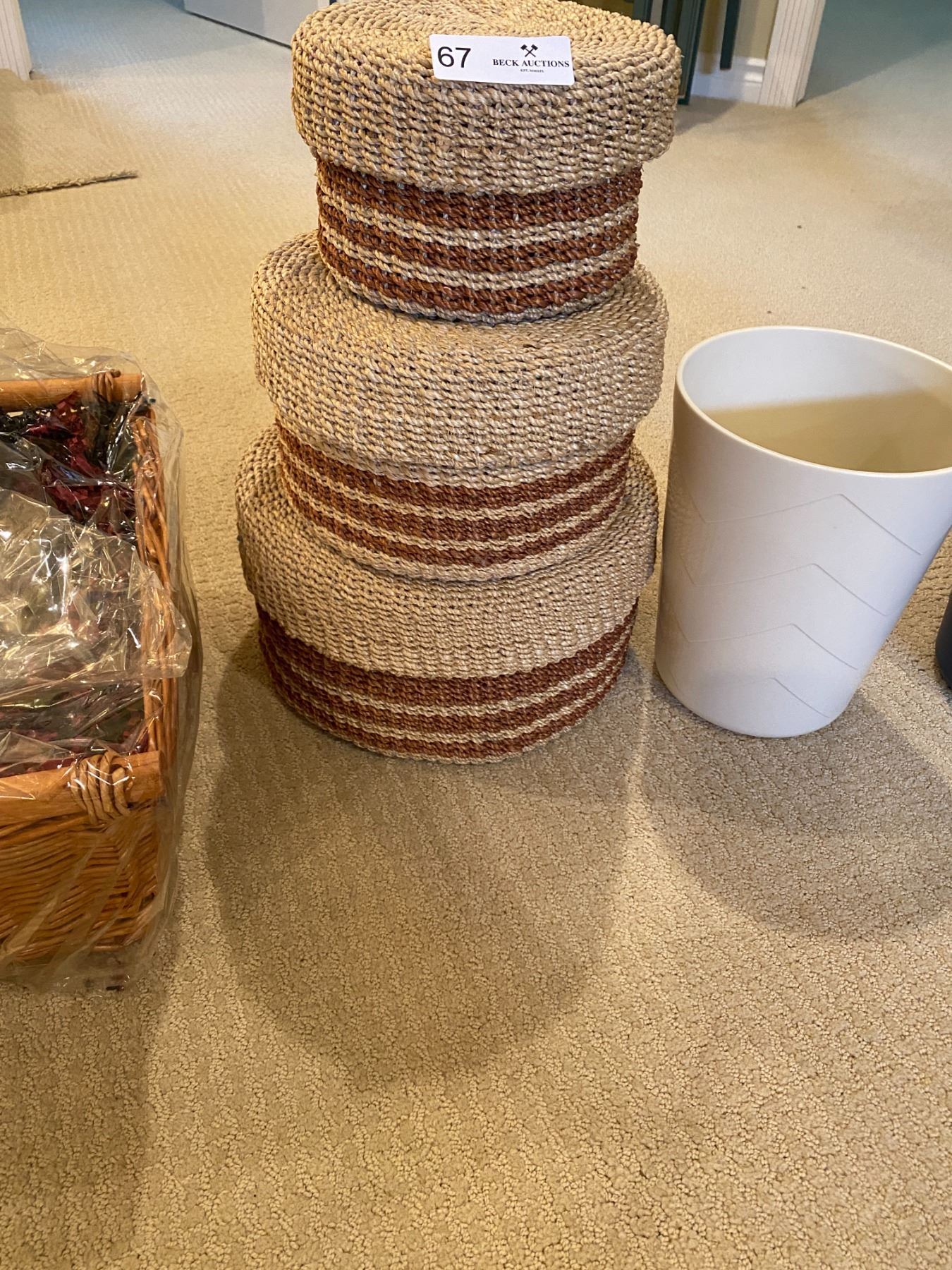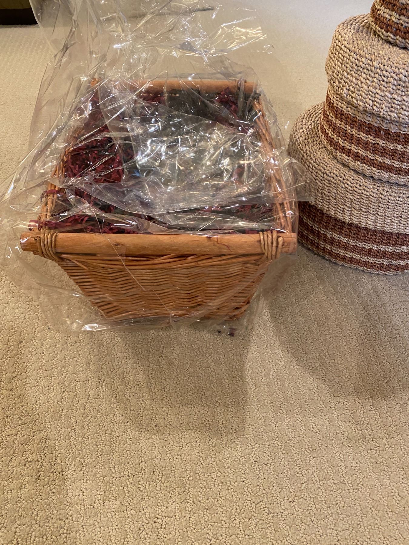Matching Set of Round Wicker Baskets, Large Gift Basket, Three Small Plastic Trash Bins