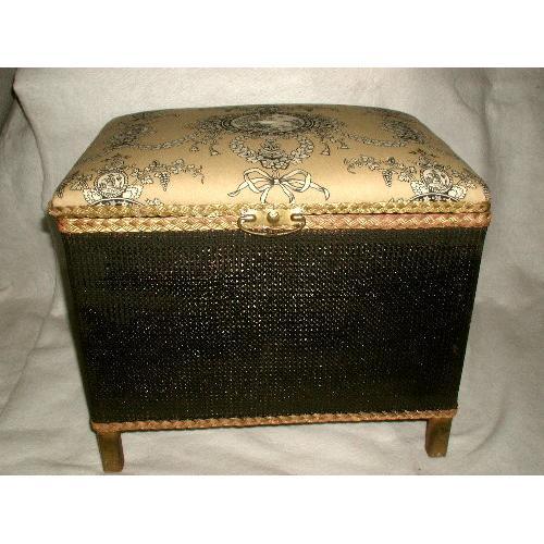 Unique black wicker hamper or trunk was made by the Lloyd Loom Company of England C.1920. Sturdy wooden interior and under support to which the wicker is attached. The bench seat has been reupholstered with a French gold,black and white medallion fabric,well padded. Brass handles on both sides as well as back plate with handle center front. Stands on gold wooden feet which compliment the gold braided trim on the lid,trunk lip and bottom. Excellent condition. Lid is attached with hinges and a wide cotton rope on left side. Measures 19L X 13W X 16H.