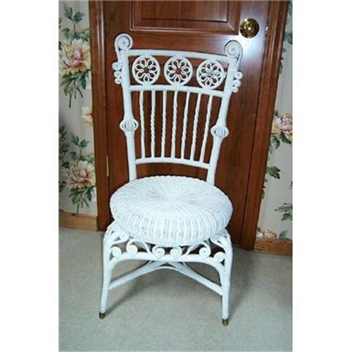 Mint condition white wicker small chair with brass feet. This chair is shown in the Wakefield Bros. catalog. It is sturdy and has no repairs.