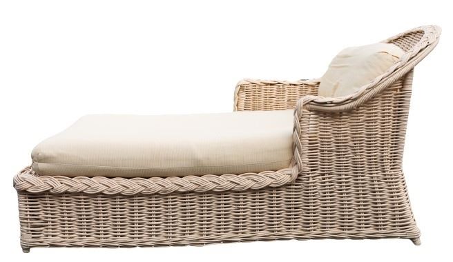 Cream upholstery with wicker material, chaise lounge, perfect for any patio.