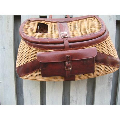 This is a extra long Wicker Creel purchased from dealer in Vancouver, Washington many years ago. He dated this creel to the 1930's. The basket is 18" long & is trimed in leather.There is leather front & rear for appeal, as well as support.The hole is to the rt & on the back of the lid, there's a fish measure in leather.Another plus is the leather fly wallet that it boasts.It has a harness, as well.This is a must have for the serious fisherman/collector.