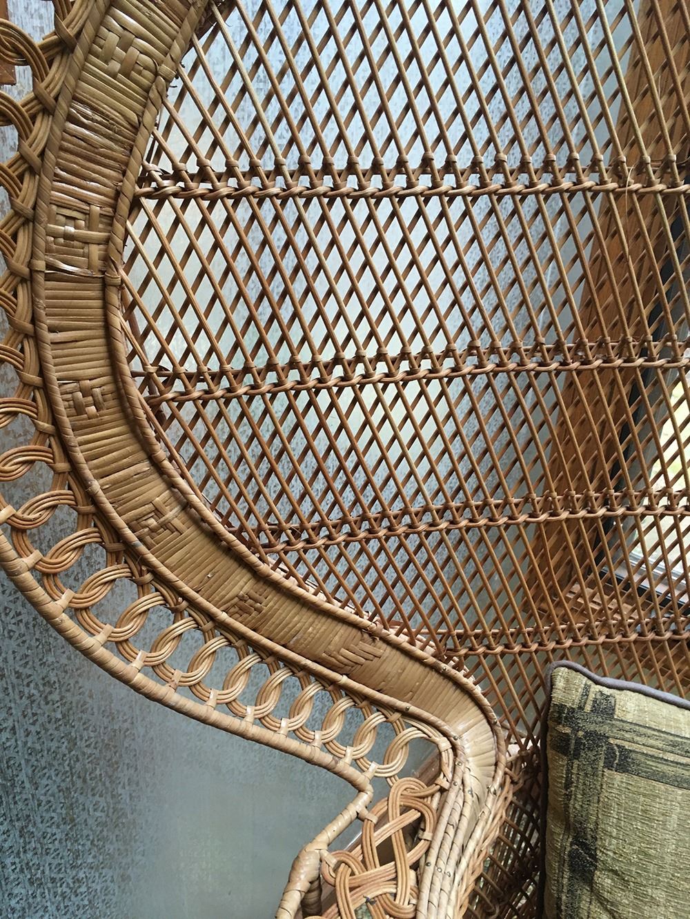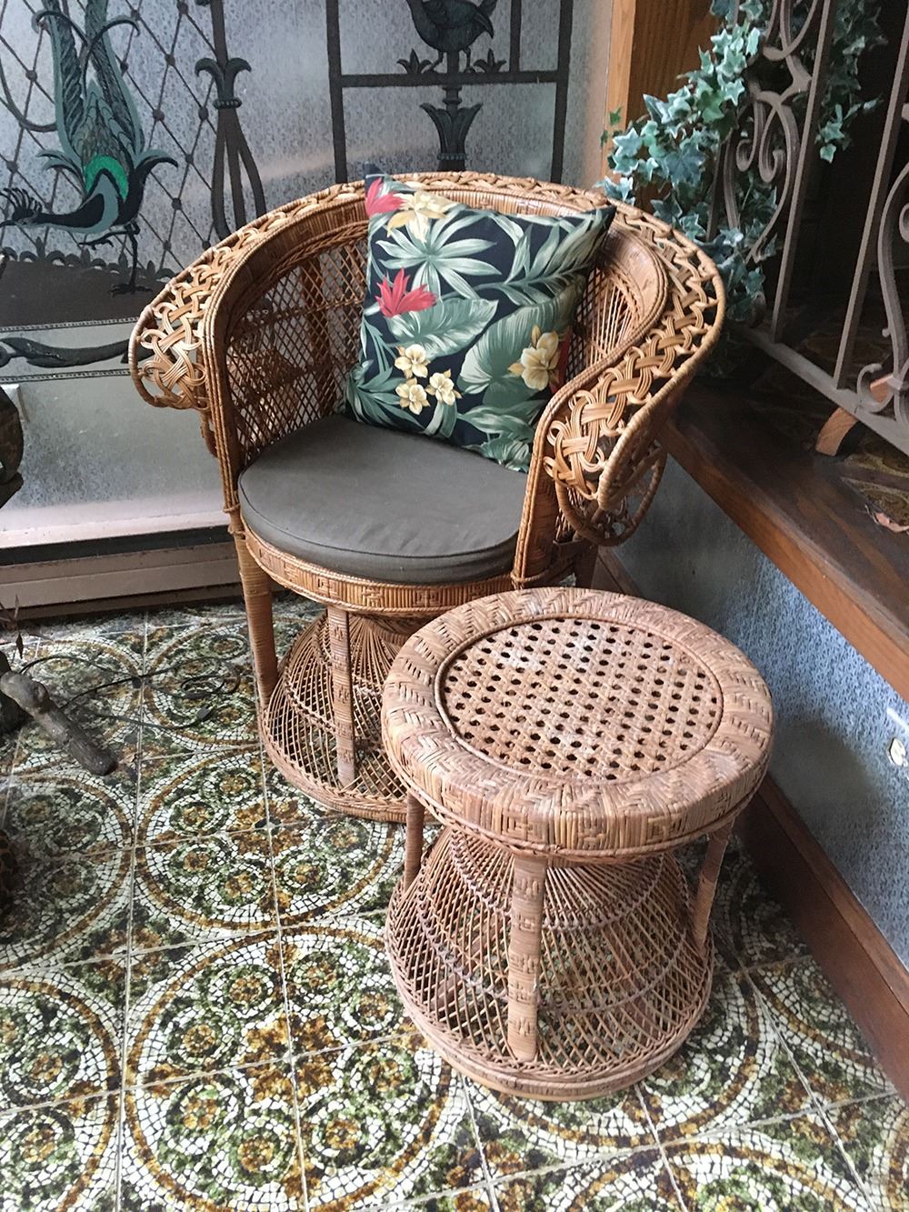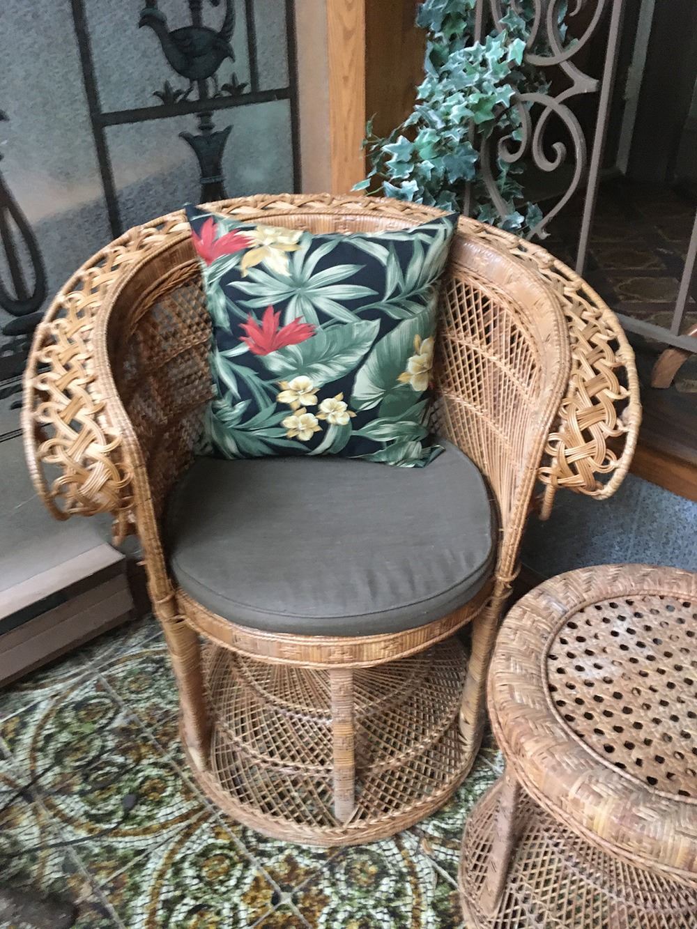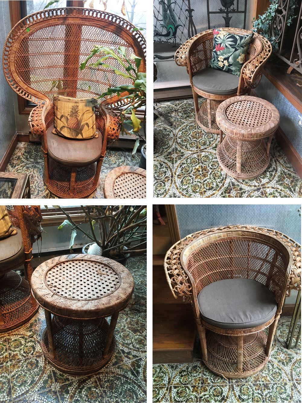 Wicker set includes Peacock chair, 2 arm chairs, and 2 tables. pd