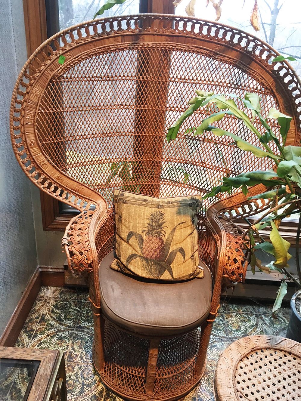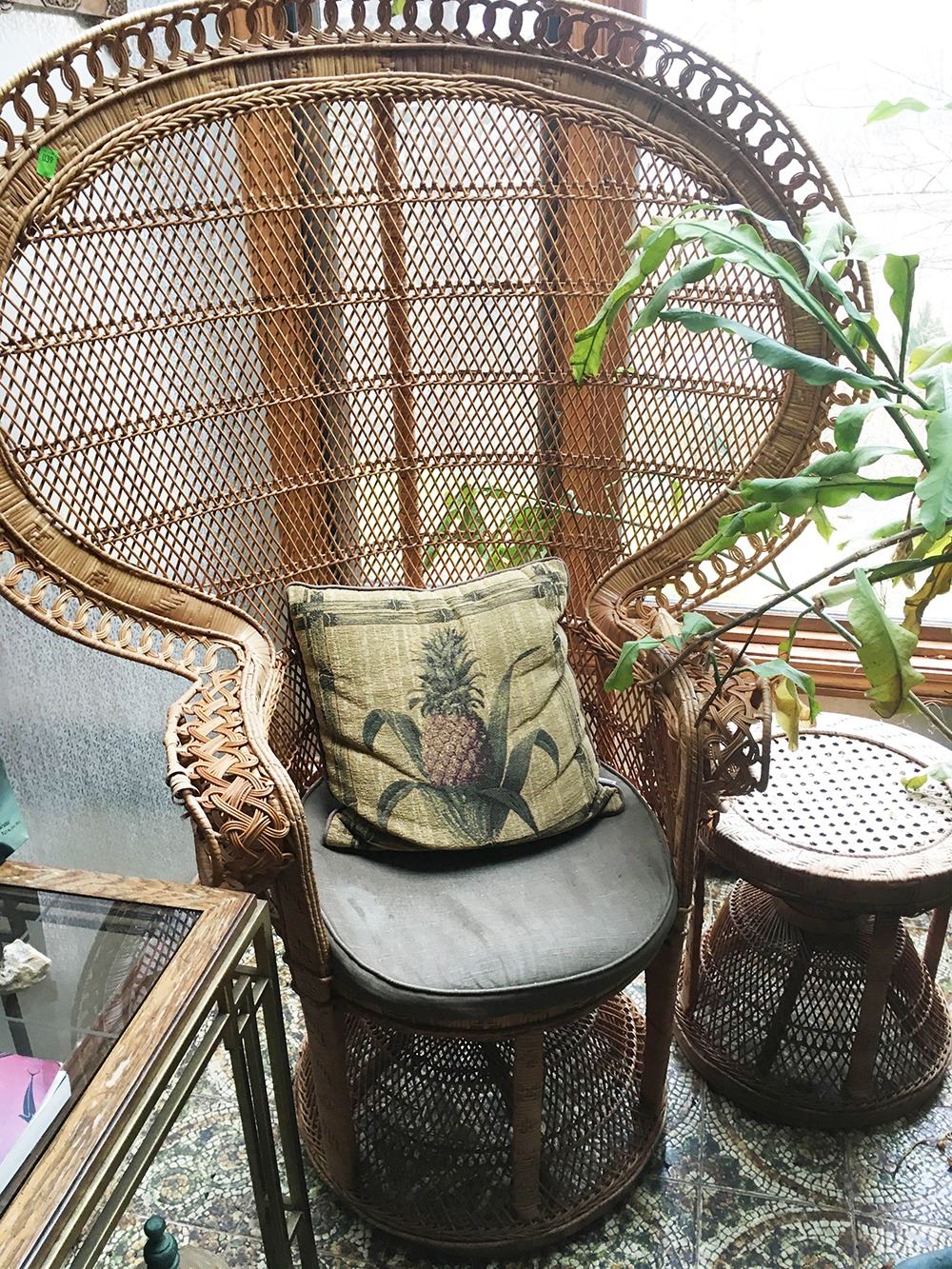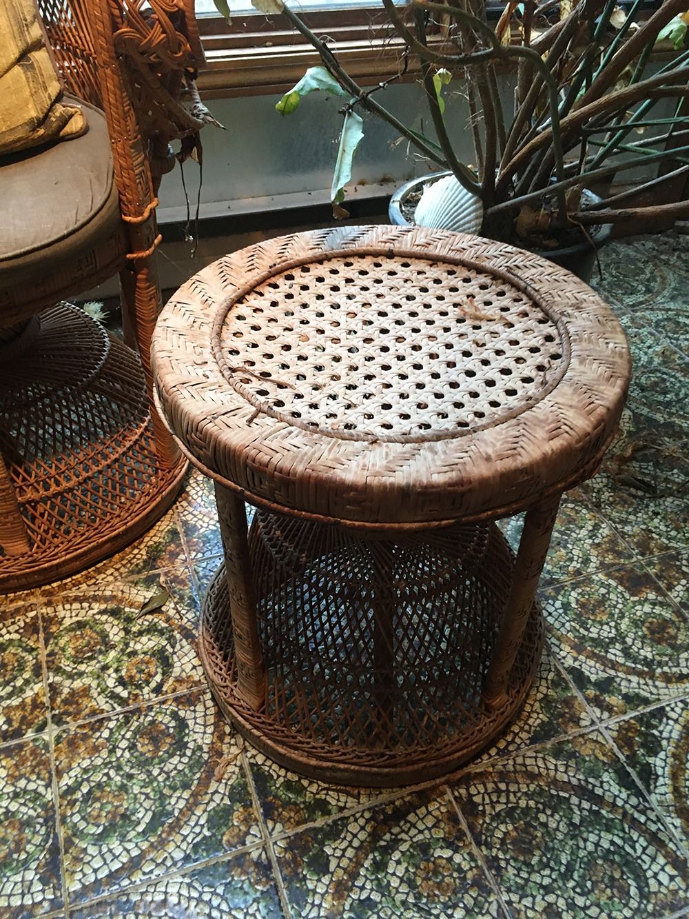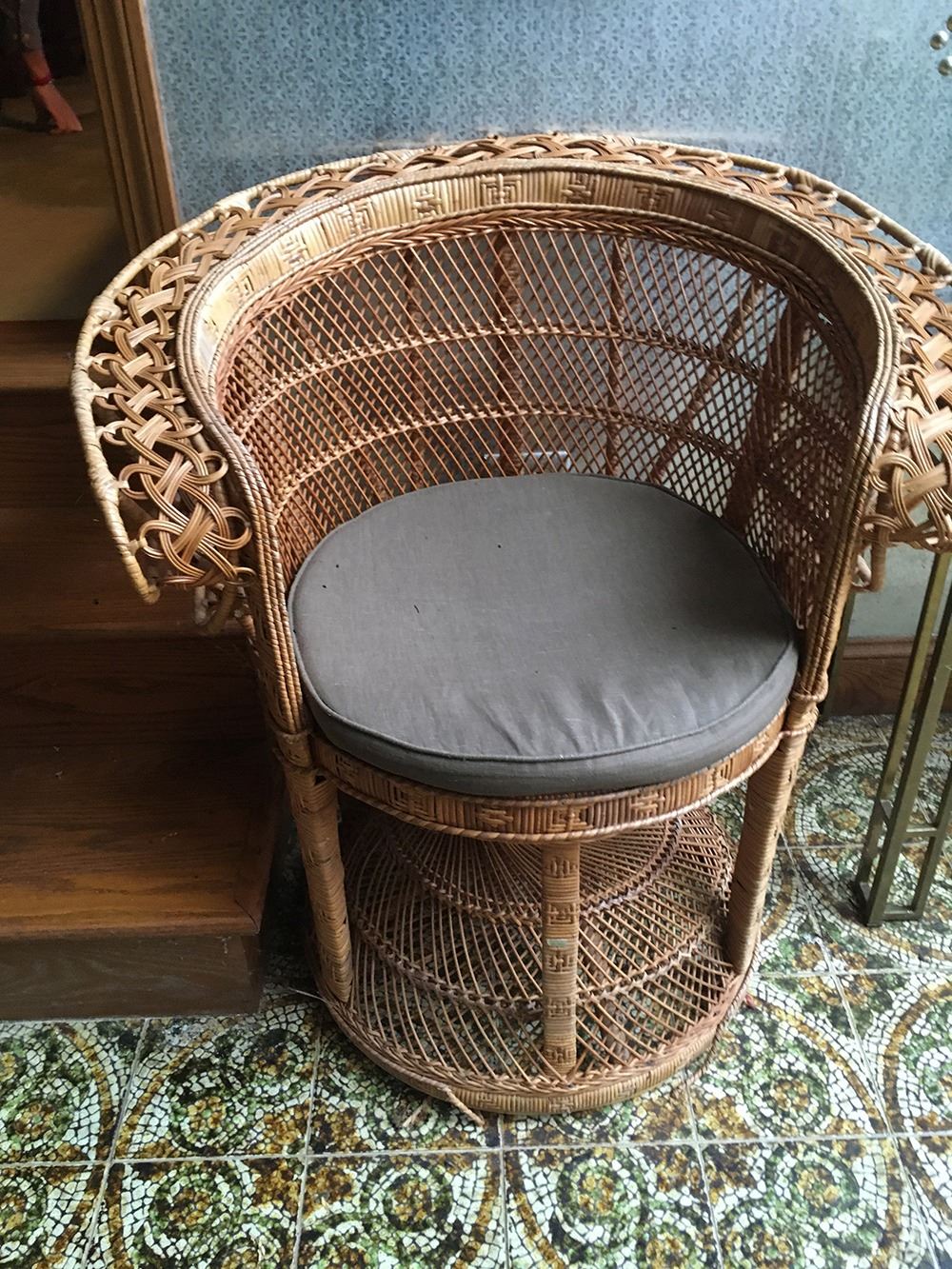 Wicker set includes Peacock chair, 2 arm chairs, and 2 tables. pd