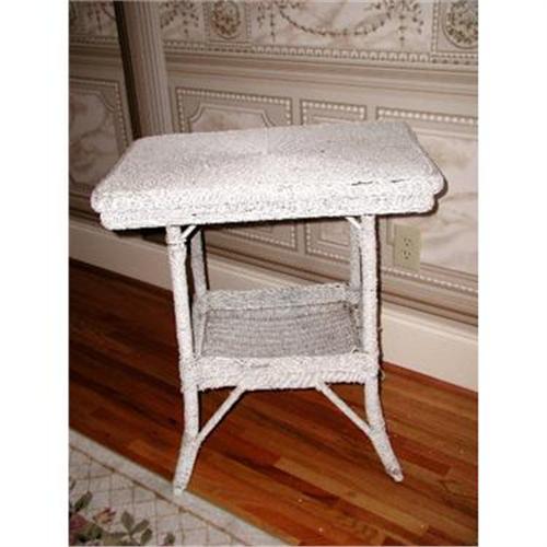 Unique 19th century white wicker table can be used in all areas from the patio to a bedroom. Large rectanglular top with a basket style lower shelf with sides. The entire table is made of finely woven wicker, small in diameter,adding to the strength of the piece. Wonderful condition,one foot appears to have lost a small amount of the wicker wrapping over the years but the existing wicker is all securely attached and the wood is white beneath the wrapping so does not detract at all. Two very small areas on apron missing a minute piece of wicker. Each leg has an additional support structure for sturdiness. Measures 27L X 29H X 19W.