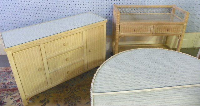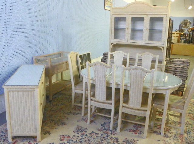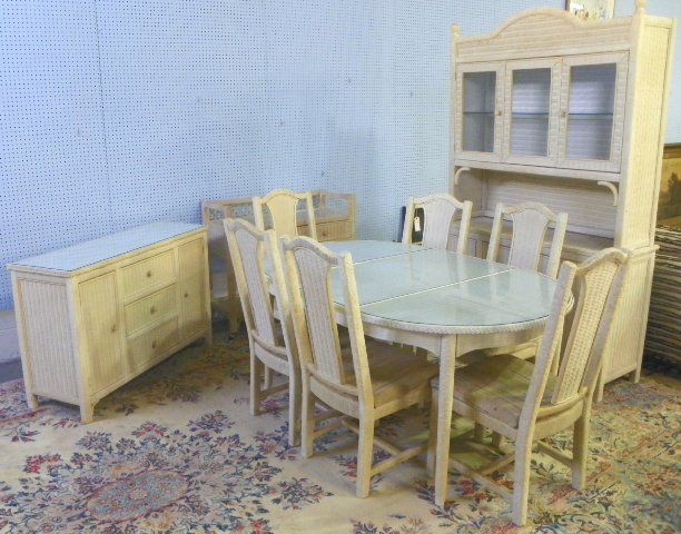 Including: 2 part China cabinet, server, teacart, round table with 1 leaf & 6 chairs. China cabinet approx. 47" W x 80" H x 17.5" D, server 49" W x 17" D x 31" H, teacart 40" W x 17" D x 35.5", 42" W x 22" leaf table.