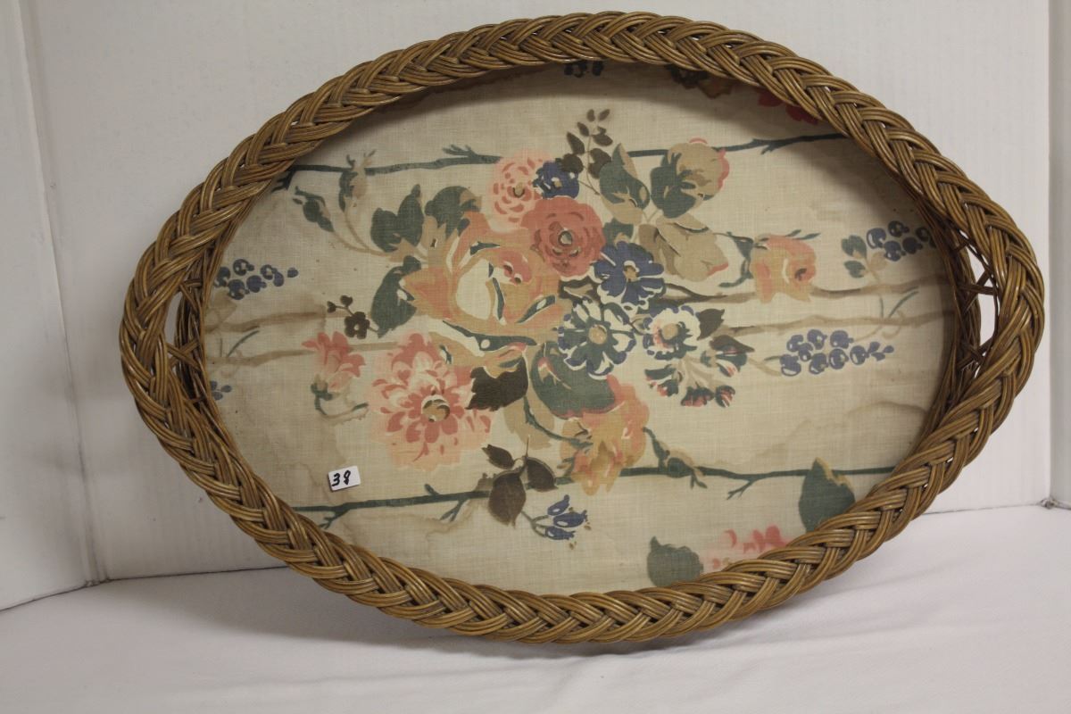 A wicker tray with floral patterns inside. Comes from the Prince Albert Sanatorium