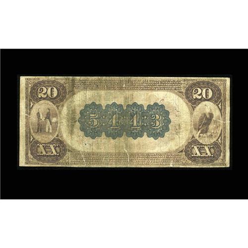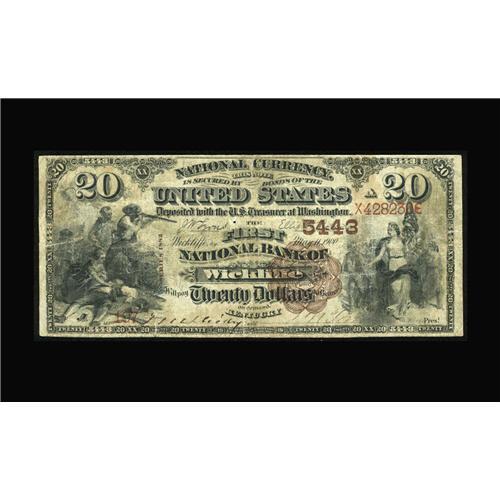 <B>Wickliffe, KY</B></I> - $20 1882 Brown Back Fr. 504 <B>The First NB</B></I> Ch. # 5443<BR>This is a very tough bank which issued Second Charter notes only before liquidating in 1917. This note is also prettier than the Brown Back that follows below. That is the good news here. The bad news is that this example has several long splits, along with surfaces that are soft and unappealing. <B>Very Good.</B></I>