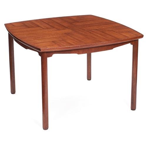 Widdicomb table, mahogany, square top with decorative pattern and curved edges over a stylized apron and round legs, original finish, paper label, 40"sq. x 26.75"h, good condition