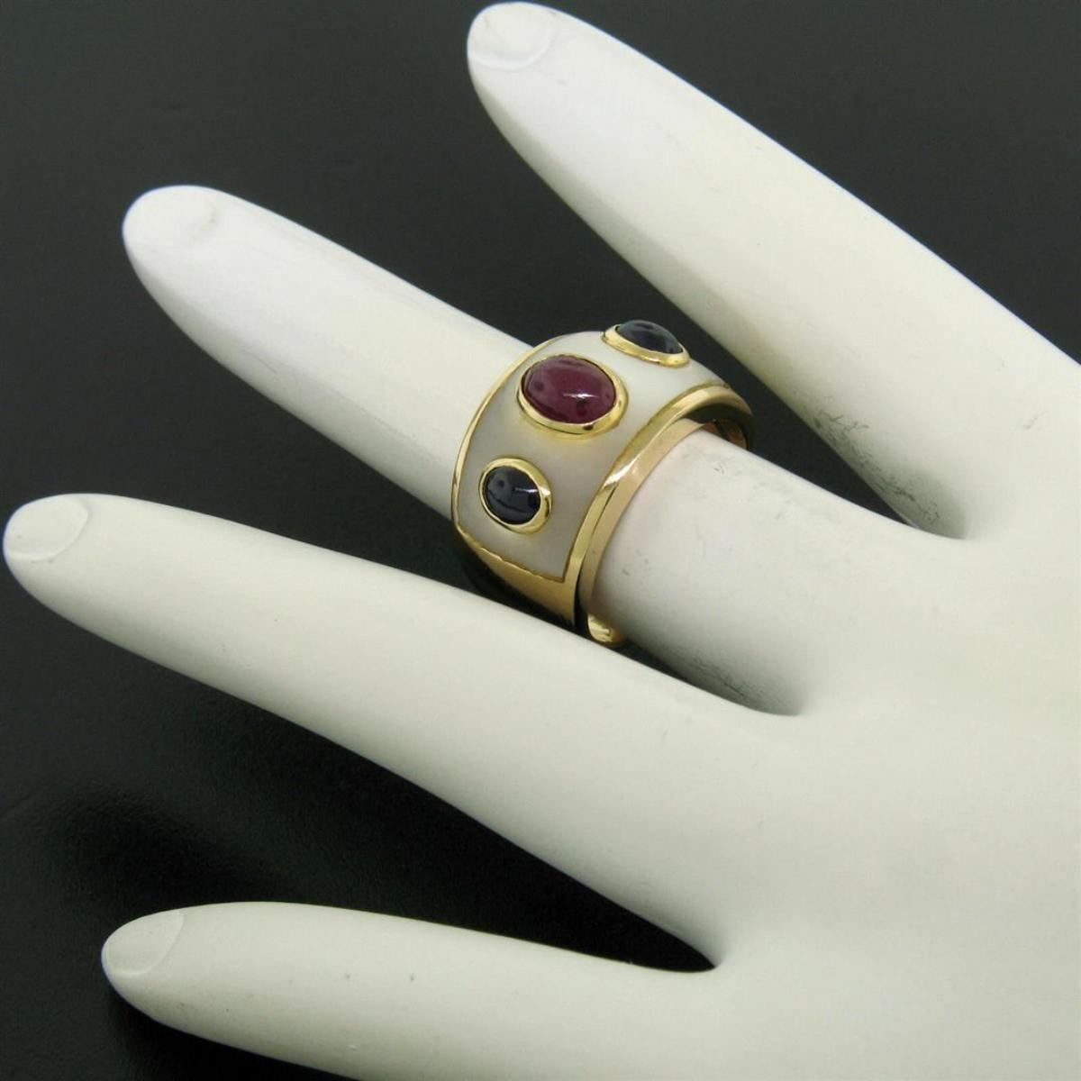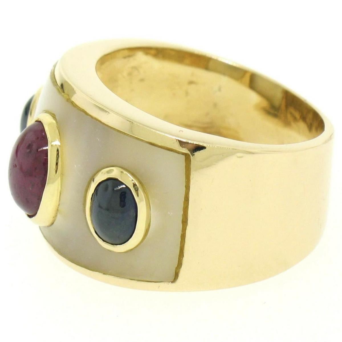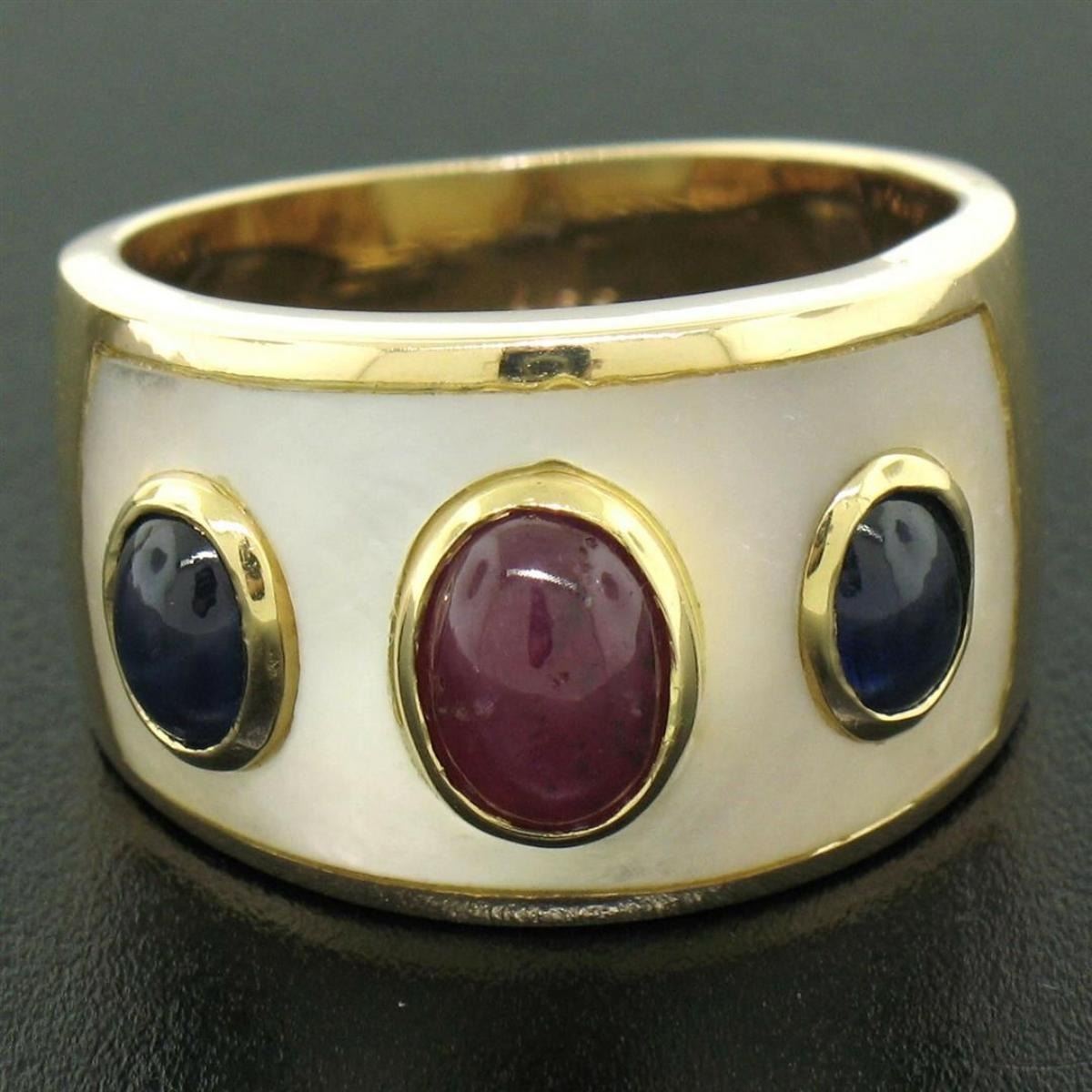 One 14K Yellow Gold 1.44ct Cabochon Cut Fine Quality Ruby Sapphire Mother of Pearl Wide Band Ring. Item Details: Material: 14K Solid Yellow Gold, Weight: 8.74 Grams, Stone(s): (1) Natural Genuine Ruby - Oval Cabochon Cut - Bezel Set - Very Rich Cranberry Red Color - 0.78ct (approx.), (3) Natural Genuine Sapphires - Oval Cabochon Cut - Bezel Set - Deep Royal Blue Color - 0.66ctw (approx.), Total Carat Weight: 1.44 (approx.), Ring Size: 5.0 (We WILL NOT custom size this ring.), Ring Width: 12.75mm, Ring Height: 6.47mm rise off the finger Condition: Original stones, no repairs. Excellent condition!