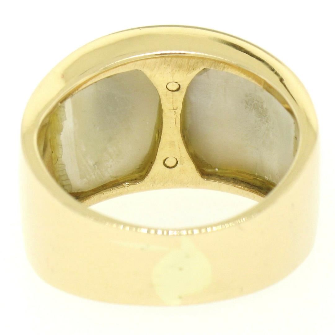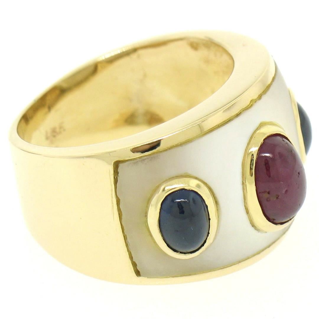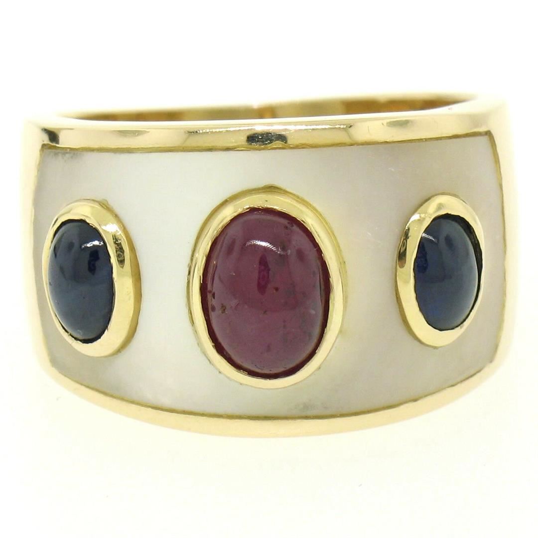 One 14K Yellow Gold 1.44ct Cabochon Cut Fine Quality Ruby Sapphire Mother of Pearl Wide Band Ring. Item Details: Material: 14K Solid Yellow Gold, Weight: 8.74 Grams, Stone(s): (1) Natural Genuine Ruby - Oval Cabochon Cut - Bezel Set - Very Rich Cranberry Red Color - 0.78ct (approx.), (3) Natural Genuine Sapphires - Oval Cabochon Cut - Bezel Set - Deep Royal Blue Color - 0.66ctw (approx.), Total Carat Weight: 1.44 (approx.), Ring Size: 5.0 (We WILL NOT custom size this ring.), Ring Width: 12.75mm, Ring Height: 6.47mm rise off the finger Condition: Original stones, no repairs. Excellent condition!