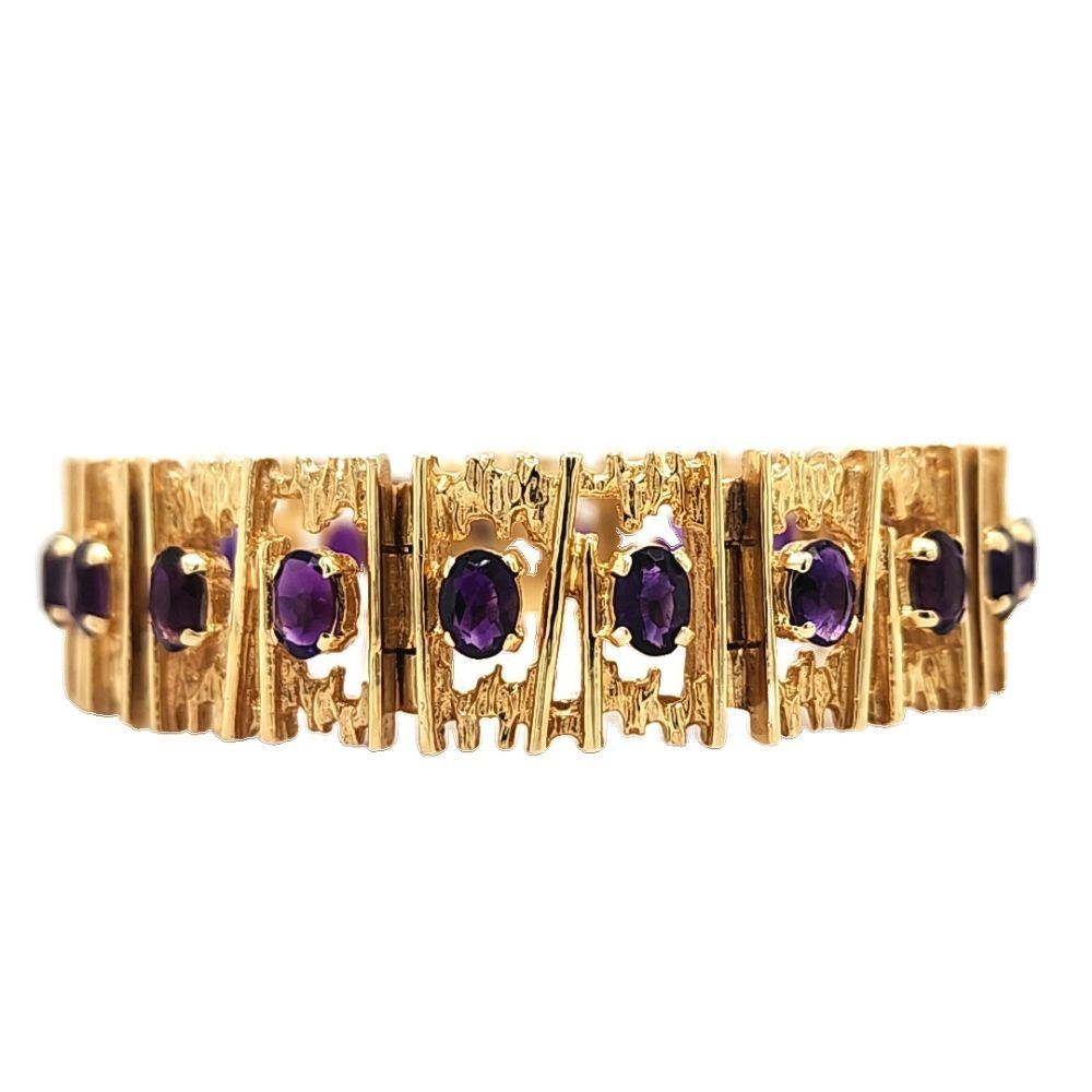 Genuine Amethyst Bracelet.& nbsp; This is a beautiful estate piece.& nbsp; Circa 1960's!& nbsp; There are approximately 7.00 carats of oval-cut, deep purple African amethysts that are prong-set in this wide 14 karat yellow gold bracelet.& nbsp; This very heavy bracelet weighs 48 grams and is constructed with panels connected by hinges and has a hidden box clasp and a safety clip.& nbsp; It is 7& quot; long and approximately 5/8& quot; wide (16.5mm).& nbsp; This is a preowned, estate item in excellent condition.