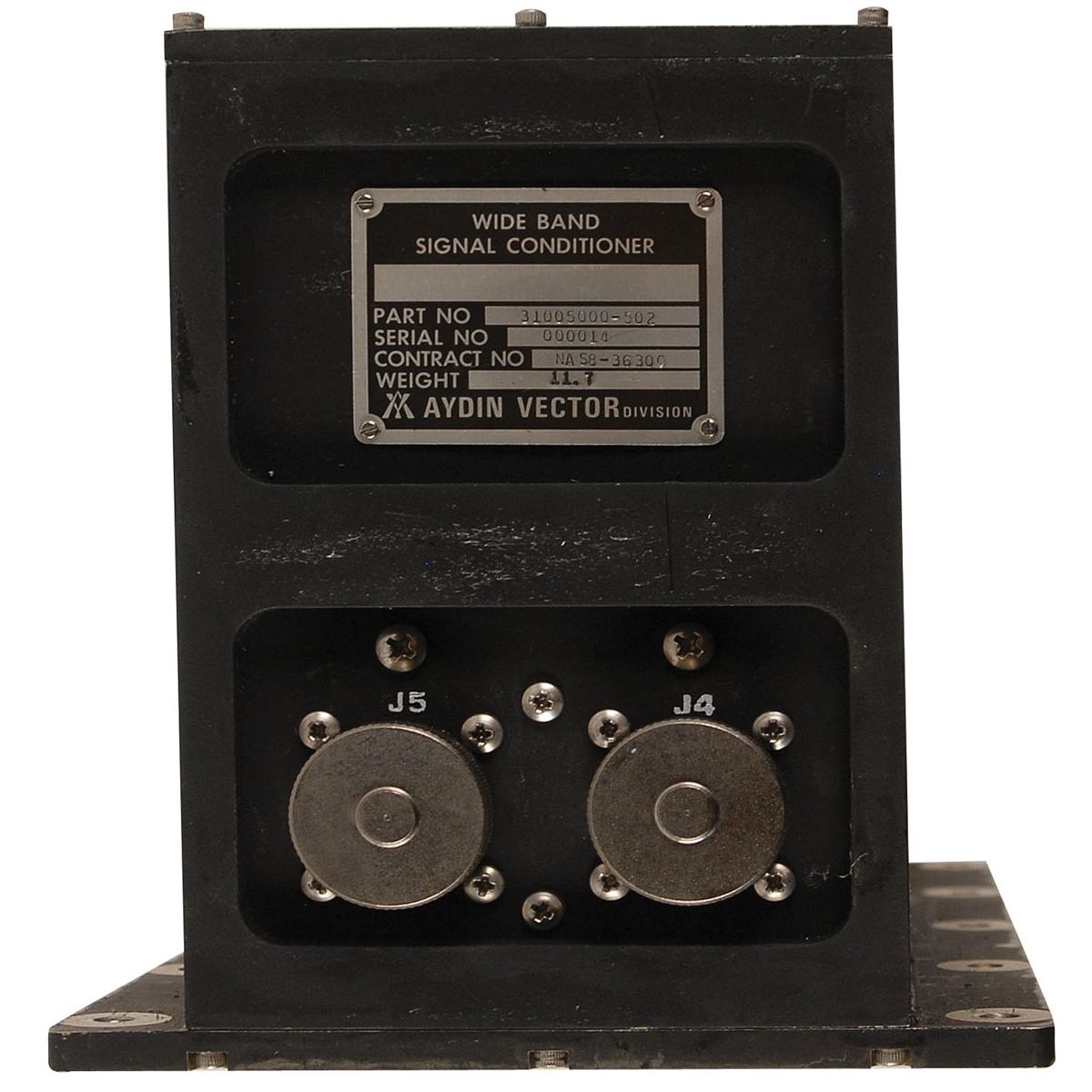 Flight-ready Wide Band Signal Conditioner, 6 x 6.25 x 11. Conditioner has two manufacturer’s labels, one from Aydin Vector, “Wide Band Signal Conditioner S/N 000014, Weight 11.75,” and a United Technologies label for “Wide Band Signal Conditioner; part No. 10400-0680-802; Accept Date 2-2-89.” Accompanied by a two-page United Technologies Part Installation tag, indicating the unit was bench tested on April 26, 1993, with second page indicating testing from 1989-1990. Also accompanied by its original red NASA bag. The signal conditioner was installed in the Solid Rocket Booster (SRB) to convert telemetry signals to digital format for downlink. In fine condition.