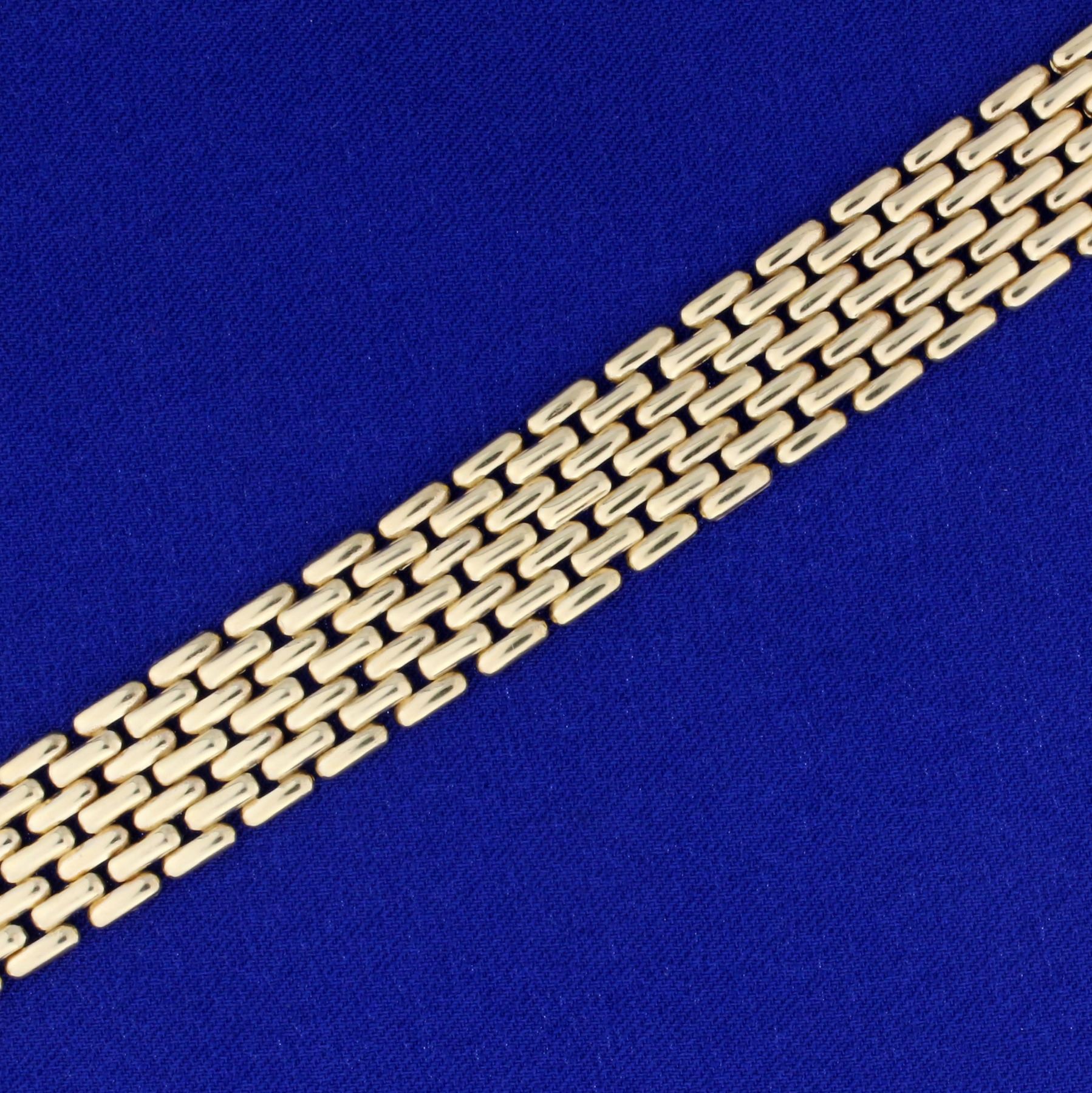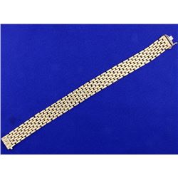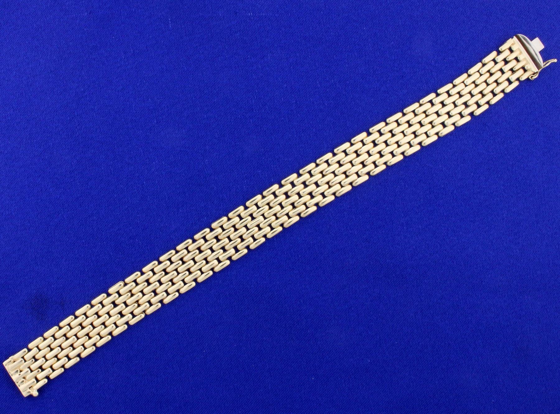 In 14K Yellow Gold. 15mm wide. 8 1/2" long with safety clasp. 22.8g