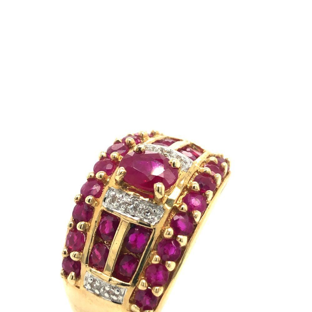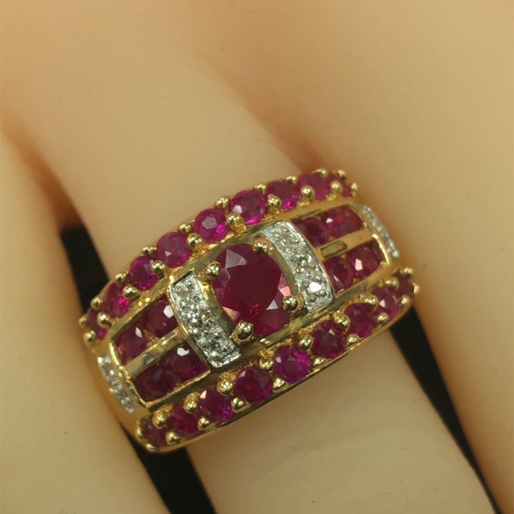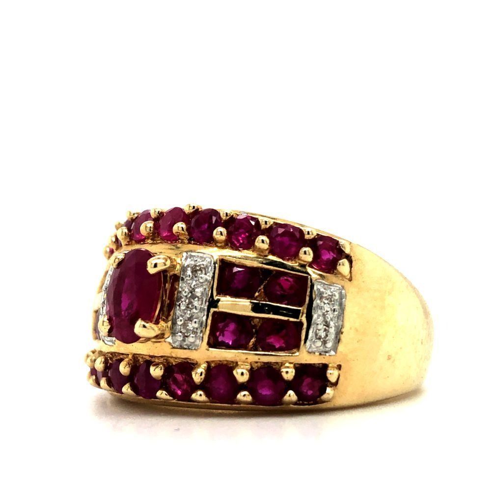 Genuine Ruby and Earth-Mined Diamond Ring. There is approximately 1.00 carats of round, faceted rubies in this 10 karat yellow gold wide cluster ring. The center oval ruby is approximately .30 carats and has accent diamonds. This ring is US size 7. This ring can be resized for an additional $100, please allow an additional 10 days for shipping if we resize it. This is a preowned, estate item in excellent condition.