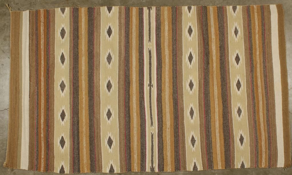 Tan, grey, gold, and red stripes. Circa 1950's. In overall good condition with 1 very small hole. Approx 33" wide x 55" long.
