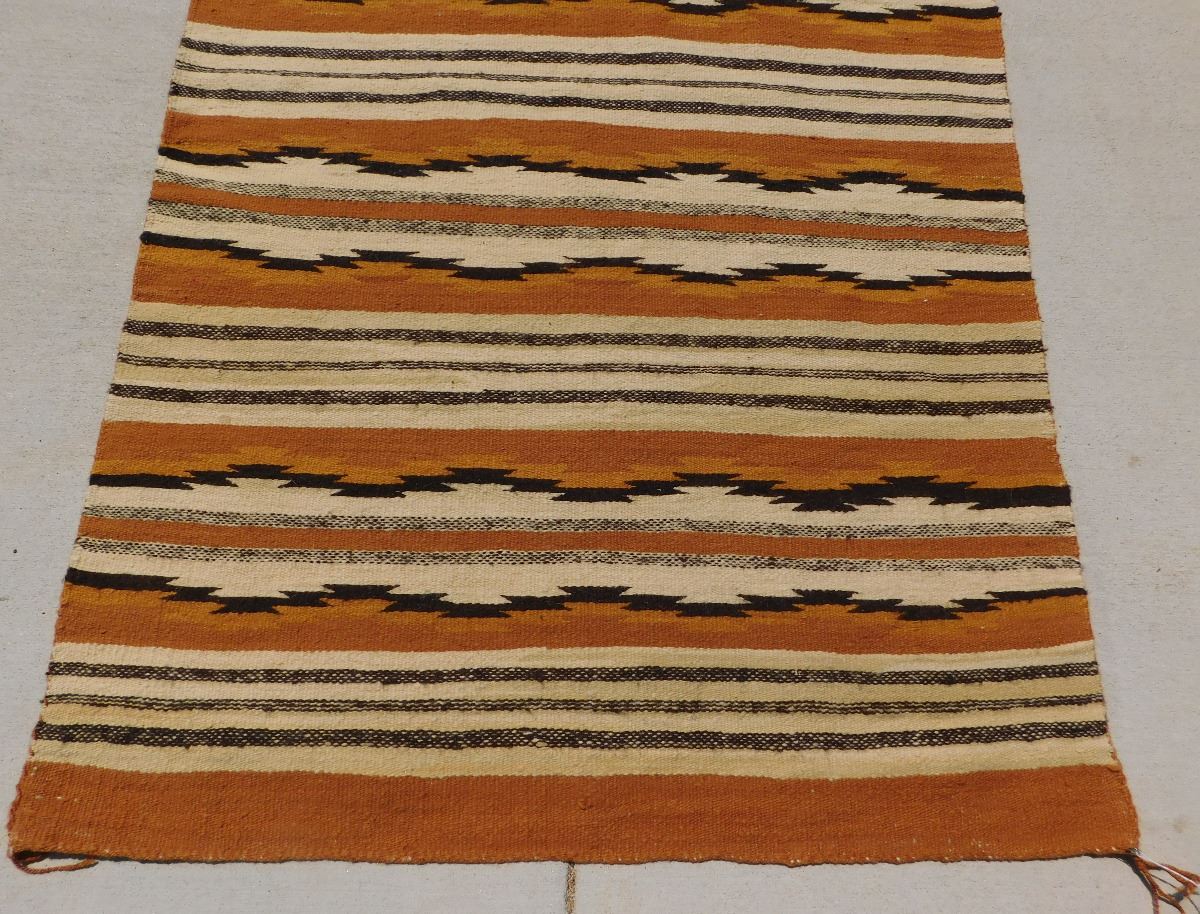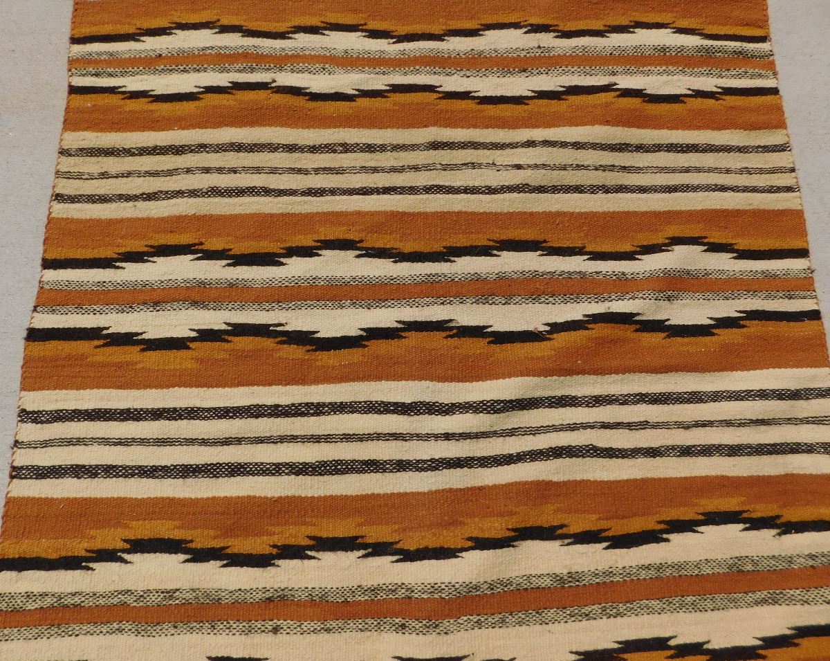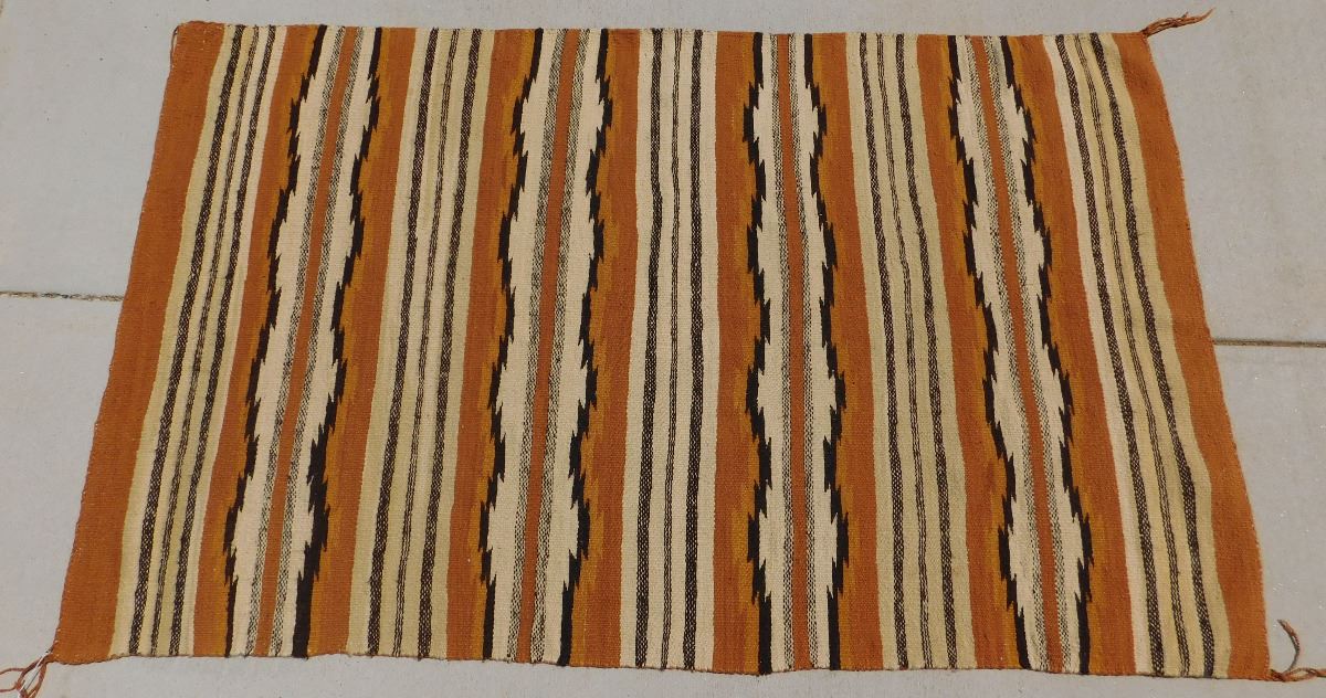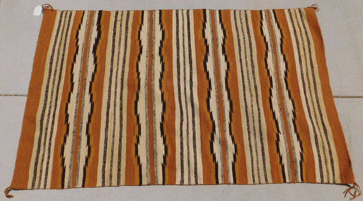 Wide Ruins Navajo Weaving, circa 1940s. Made of wool and measuring 65" x 39". Navajo, from Arizona. Striped design. Condition: Good, see images. Shipping: $27.50.
