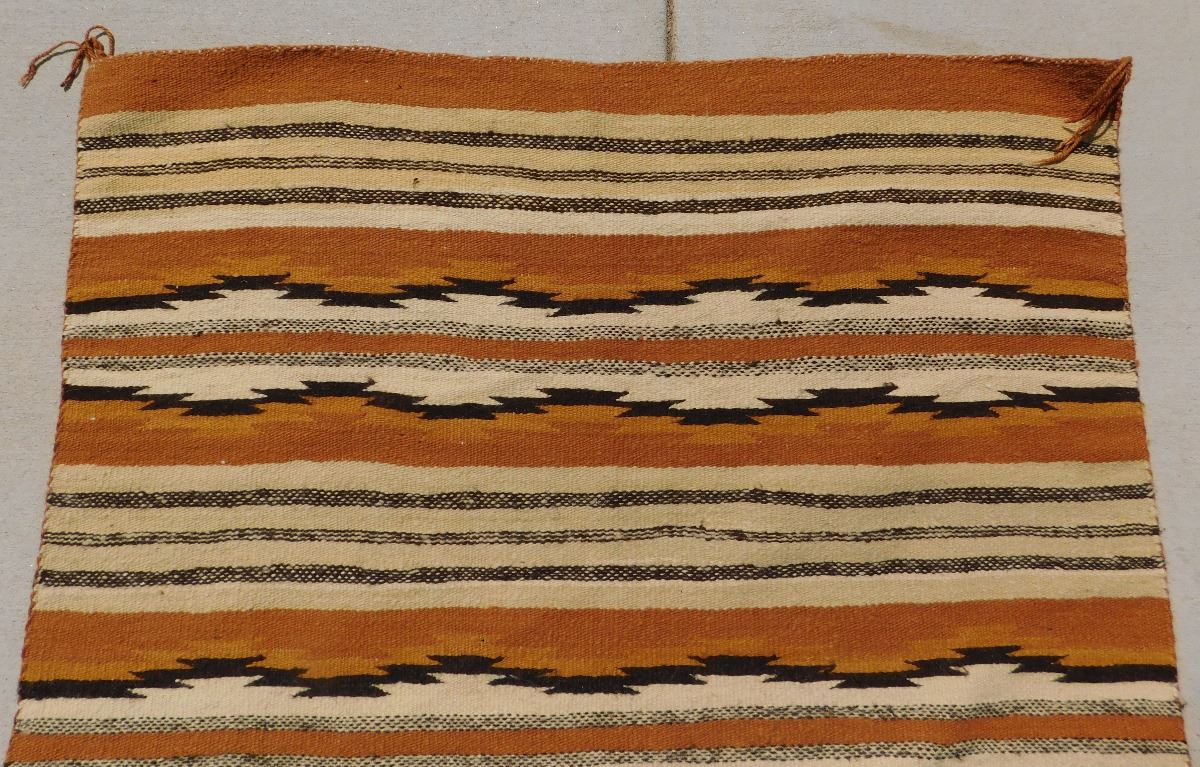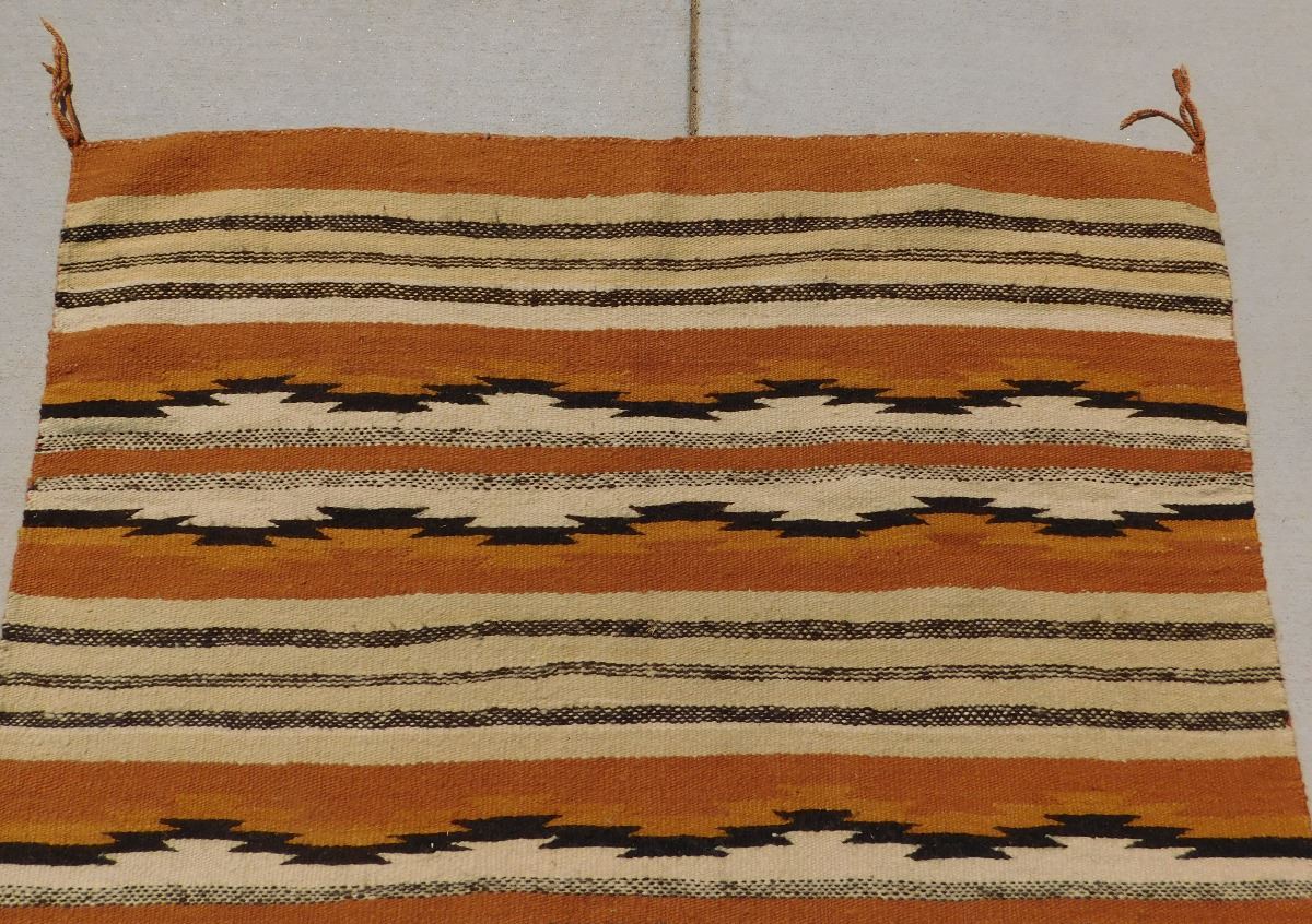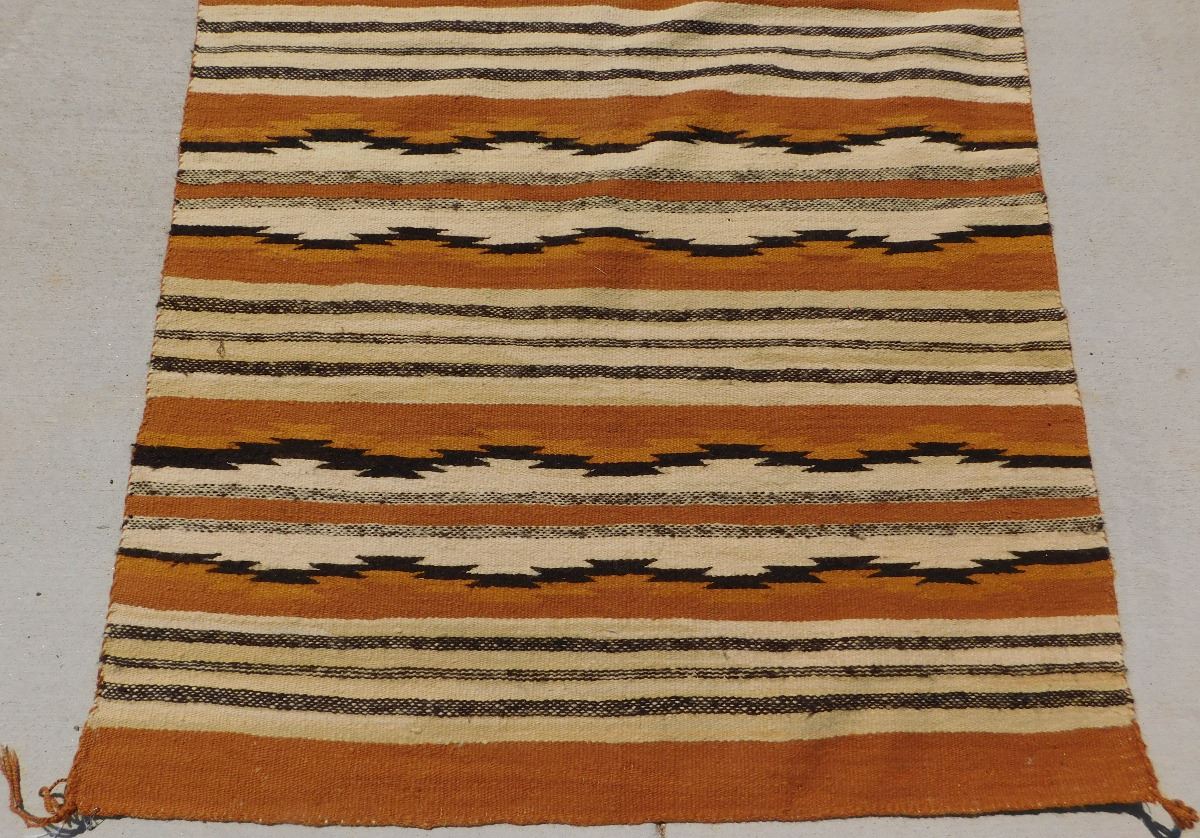Wide Ruins Navajo Weaving, circa 1940s. Made of wool and measuring 65" x 39". Navajo, from Arizona. Striped design. Condition: Good, see images. Shipping: $27.50.