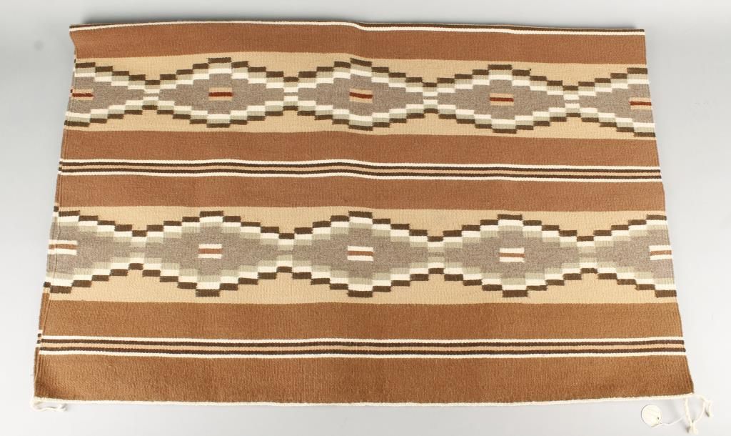 In brown, green, grey, and maroon, striped with geometric pattern, very tightly woven, measures 48" X 39" in overall near excellent condition.