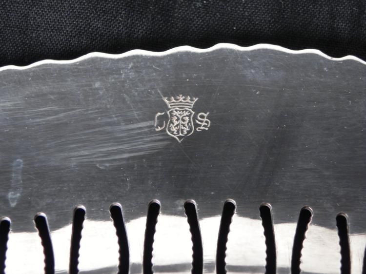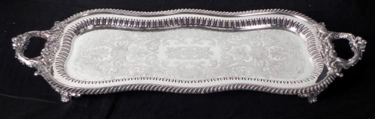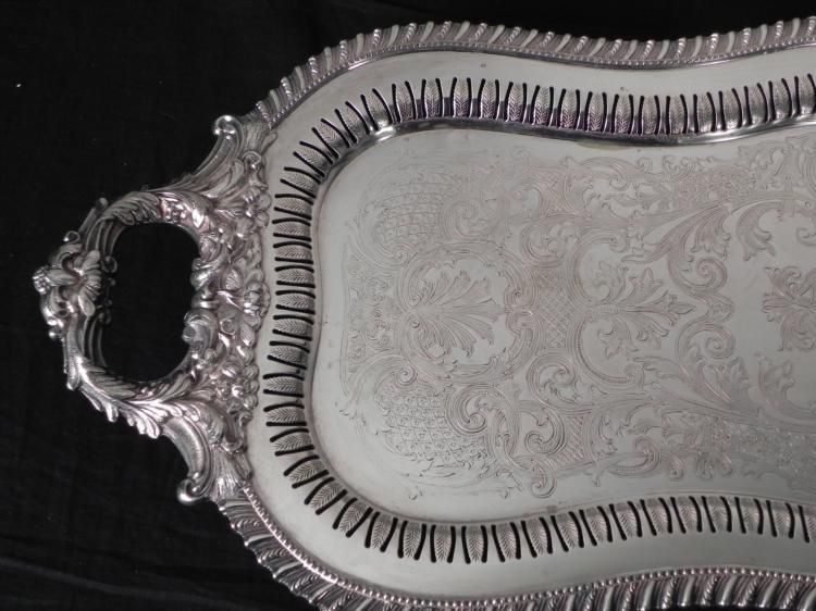 This wide, 4 footed and handled serving platter has an elegant shape, and fanciful designs overall, including pierced ornamentation all the way around. Its size is 12 x 30 1/2 inches at the handles, so it is quite large. There is a hallmark, CS, and no silver mark, but we believe it is silver plated. Its condition is excellent, with no dents or stains. It will bring elegance to a large table.