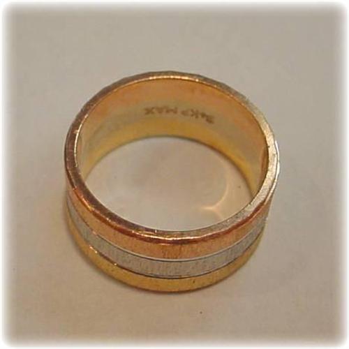 This exquisite ring fuses 3 tones of etched, Solid, 14 Karat Gold! See detailed specifications below. This item is brand new and comes with a 14 day, no questions asked, money back guarantee (less shipping and handling). Shipping Charges: $6 per item. When 3 or more items are won at an auction, shipping charges are reduced to $3 per item. (Canadian Shipping Charges: $15 for the first item and $3 for each additional item.) Shop with confidence! Seller is bonded, and maintains excellent feedback. Thanks for your interest. Live Auction info can be viewed at http://pages.ebay.com/liveauctions/help/welcome/overview.html