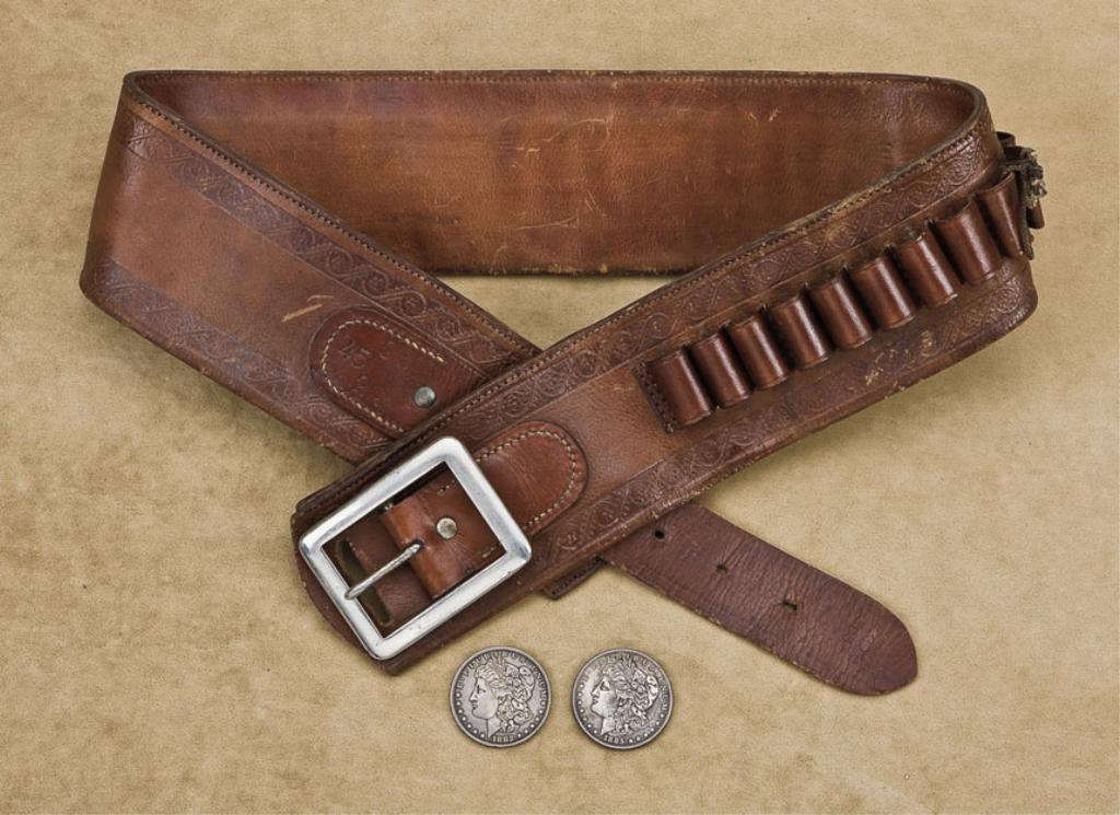 Wide tooled leather combination money/cartridge belt with square nickel buckle, no maker’s marks but “stock” marked “99 45 22” at the base of the tongue; back side of the belt has an old inscription “O.F. Hinz1906”. This belt is in overall worn but good condition showing a later replacement of the cartridge loops; accompanied by two old US Morgan Silver Dollars dated 1882 and 1885 that look aged and darkened as if they were carried for years in something like a money belt. A nice belt that would improve the appearance of any loop holster for a big frame revolver like a Colt SAA. Est.: $750-$1,500.