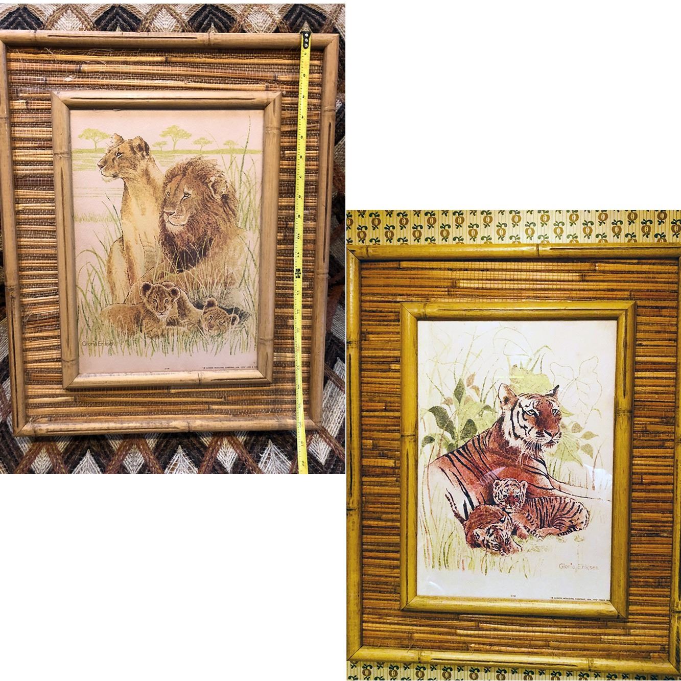 Lion and Tiger wildlife prints by Gloria Eriksen, A Windsor Art Product by Illinois Moulding Co., Chicago, Illinois. Both in matching bamboo frames.