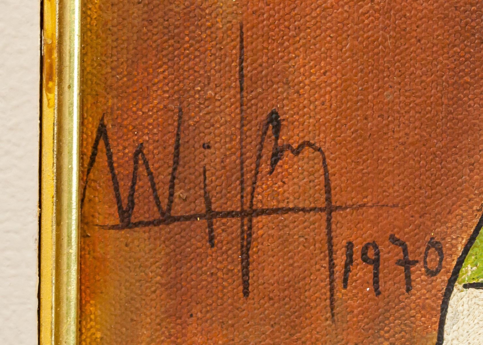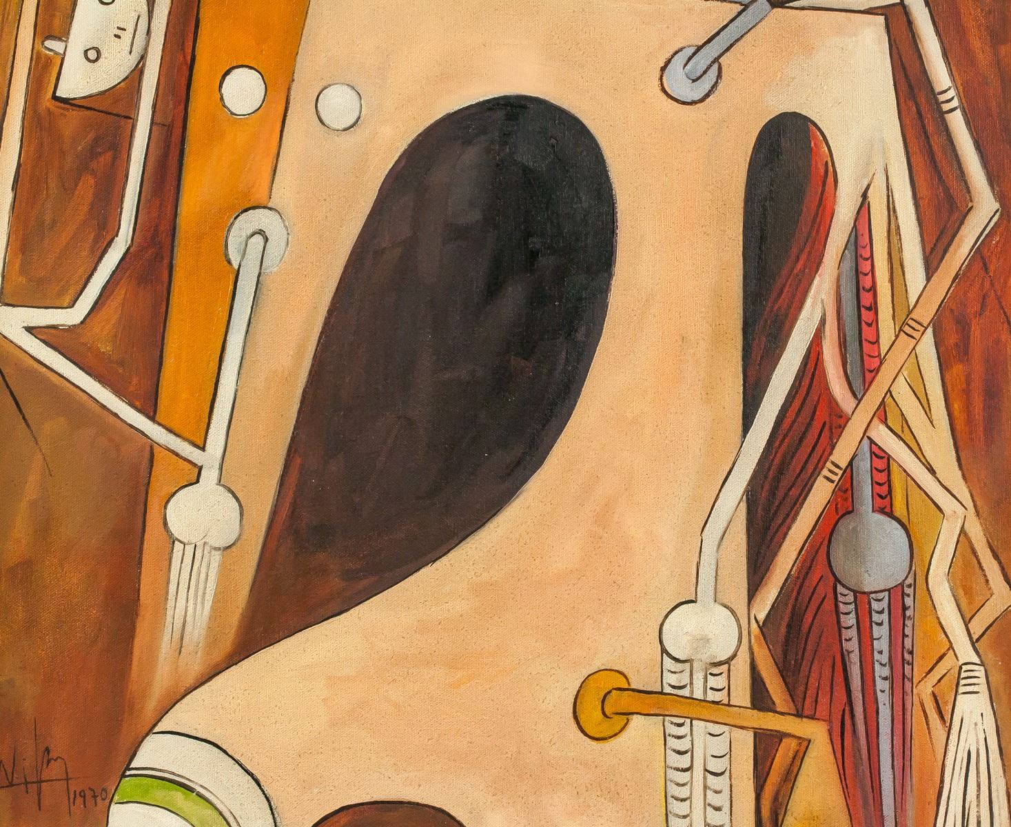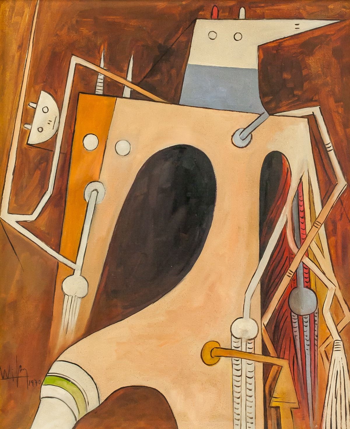 Oil on canvas, framed. Featuring a cubist figure portrait with a smaller figure on the shoulders. Signed Wil Lam and inscribed 1970. Attributed to Wifredo Lam (1902-1982, Cuban). 58 x 48 cm (22.8 x 18.9 inches). Frame size: 77 x 68 cm (30.3 x 26.8 inches)
