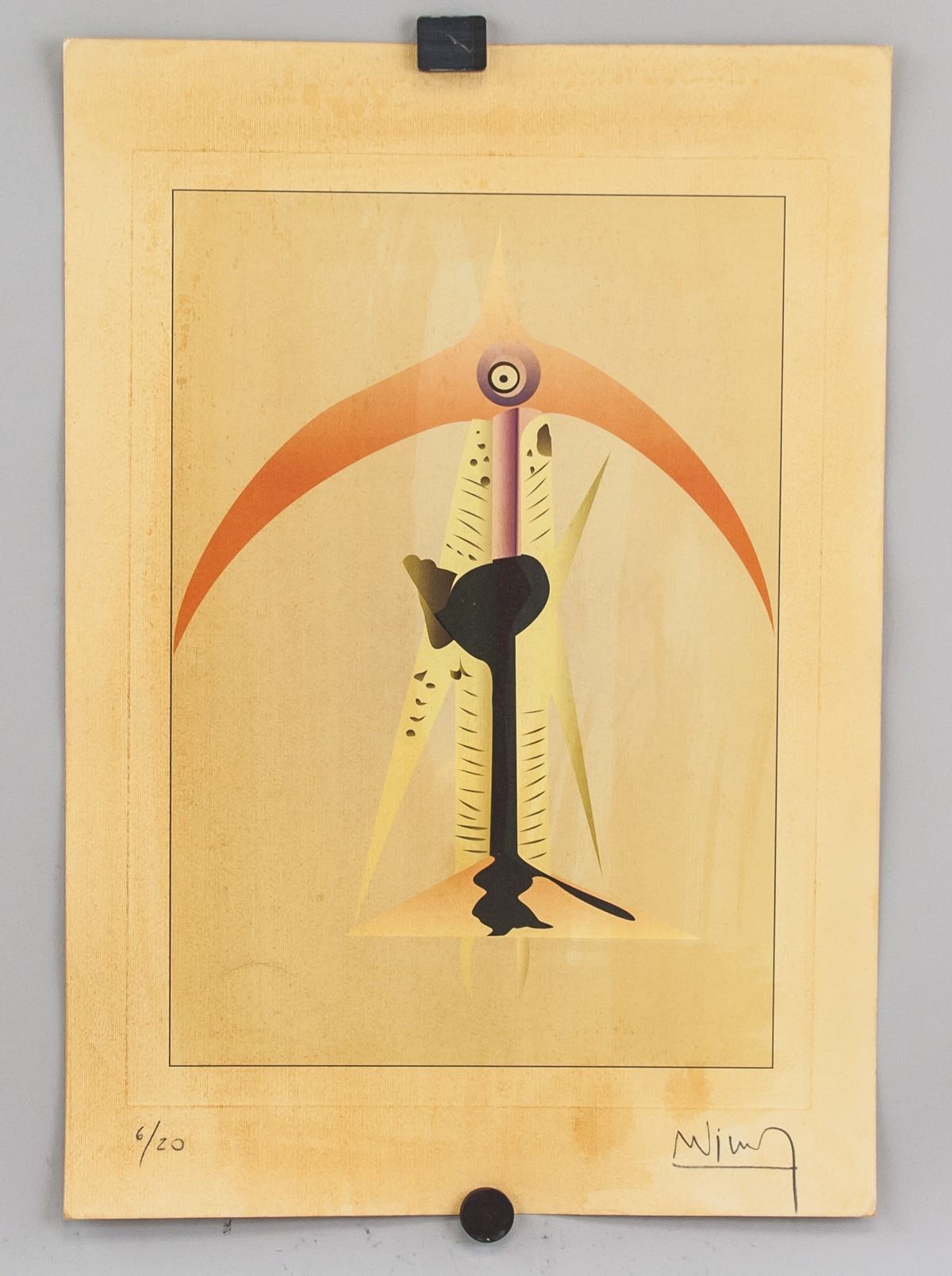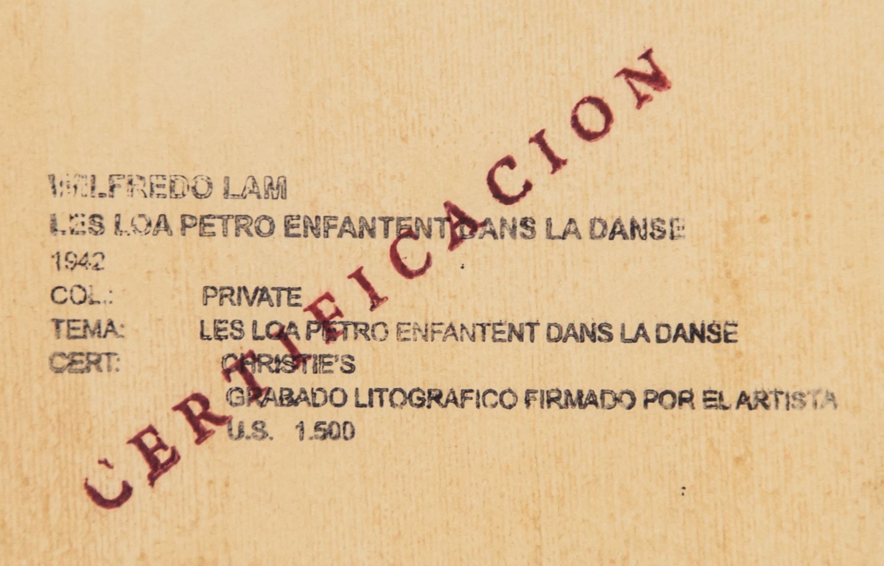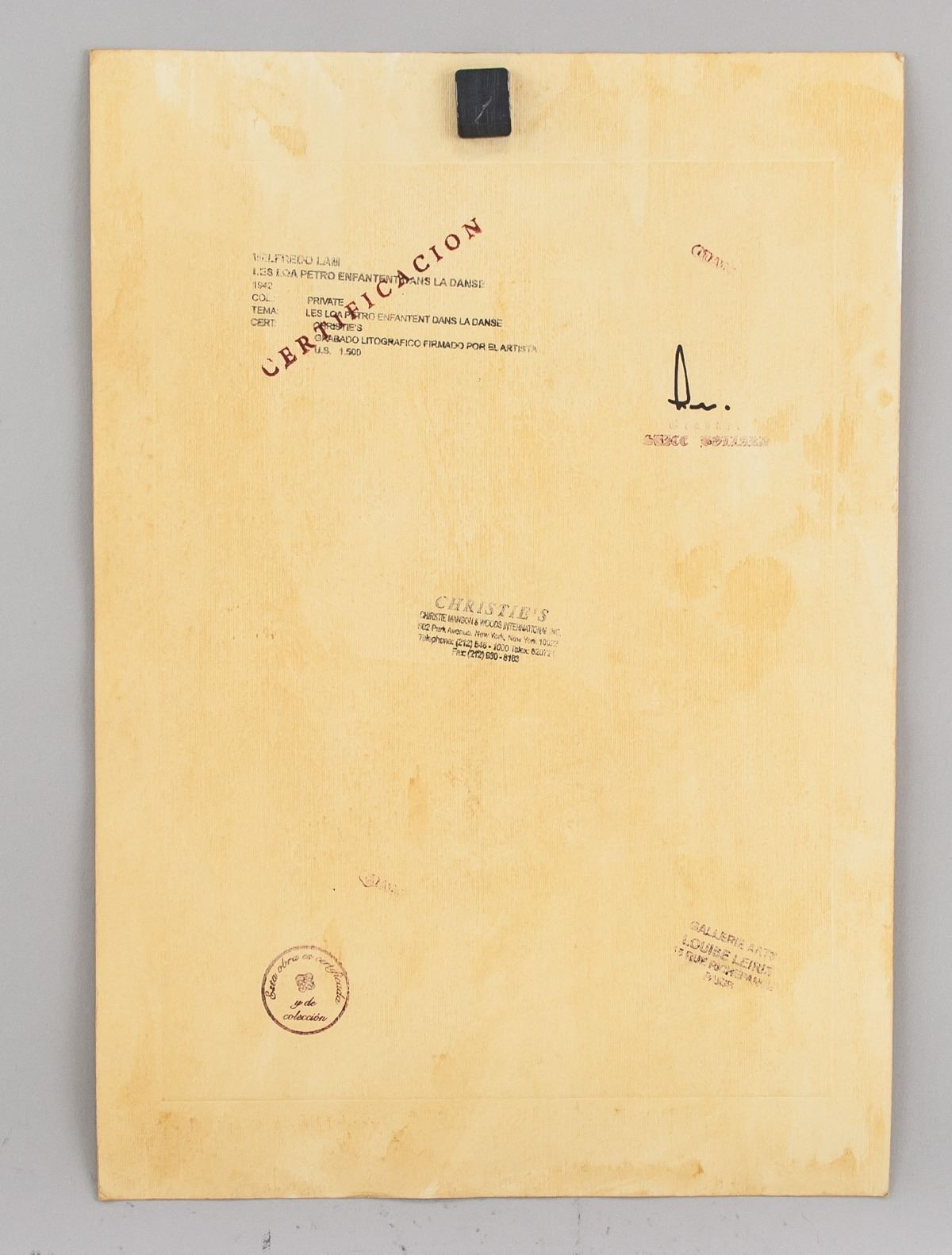 Lithograph on paper. Featuring a surrealist composition. Signed WiLam and inscribed 6/20 on the lower right and lower left corner, respectively. Inscribed on verso WILFREDO LAM / LES LOA PETRO ENFANTENT DANS LA DANSE / 1942 / COL: PRIVATE ? TEMA: LES LOA PETRO ENFANTENT DANS LA DANSE / CERT: CHRISTIE'S / GRABADO LITOGRAFICO FIRMADO POR EL ARTISTA / U.S. 1.500 and stamped CERTIFICACION. Stamped CHRISTIE'S / CHRISTIE MANSON & WOODS INTERNATIONN INC. / 502 Park Avenue. New York, New York 10022 / Telephone: (212) 930-8183 on verso. Stamped GALLERIE ARS LOUIsE LEIRIS 15 RUE. 31 x 21 cm (12.2 x 8.3 inches)