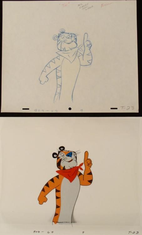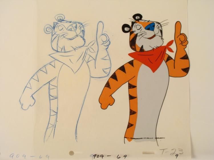 Tony is wiggling his finger in the air * * * Original Drawing and Animated Cel Original "rough" animation drawing, in non-photo blue, red and black pencil. * * * Overall size is a 12-field drawing that is 10 1/2" × 12 1/2" * Overall Size of the Cels: 10 1/2" x 12 1/2" * Condition: Very good * * * This is an original hand-painted cel set-up used in the production of the "Frosted Flakes Commercial." Each one-of-a-kind set-up represents a slight change in position of the characters. When * individually photographed and projected in rapid succession, the images appear to move. * * To create production cels, the original animator's drawing is transferred onto an acetate cel (by hand-inking and/or photo copying). * * * Traditional animation is a multi-step process which includes various types of art techniques. Drawings are a key part of the process, in which the animator creates the design and movement of the characters. Drawings are then transferred onto acetate cels * (by hand-inking and/or photo copying) to create a production cel, which is then hand painted on the back side, using paint colors chosen and approved by the creator of the series. * *
