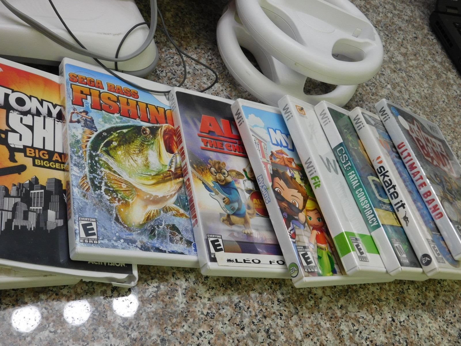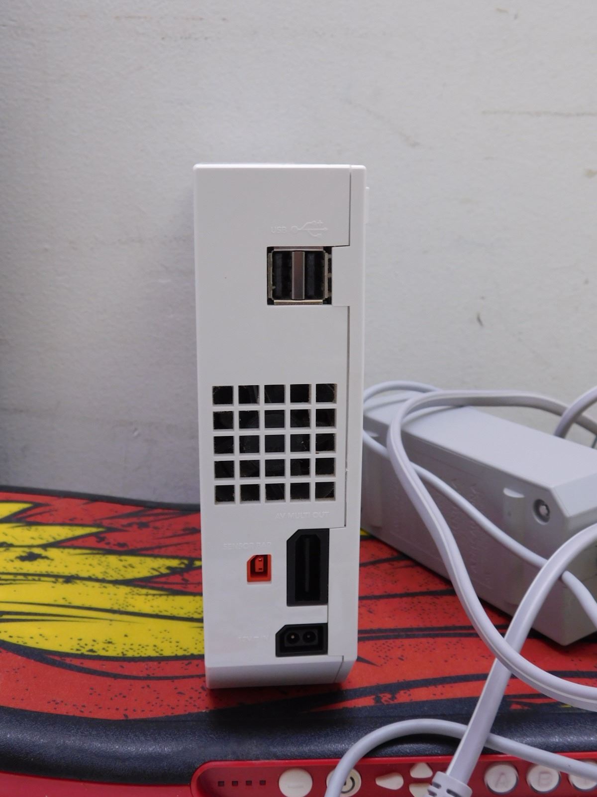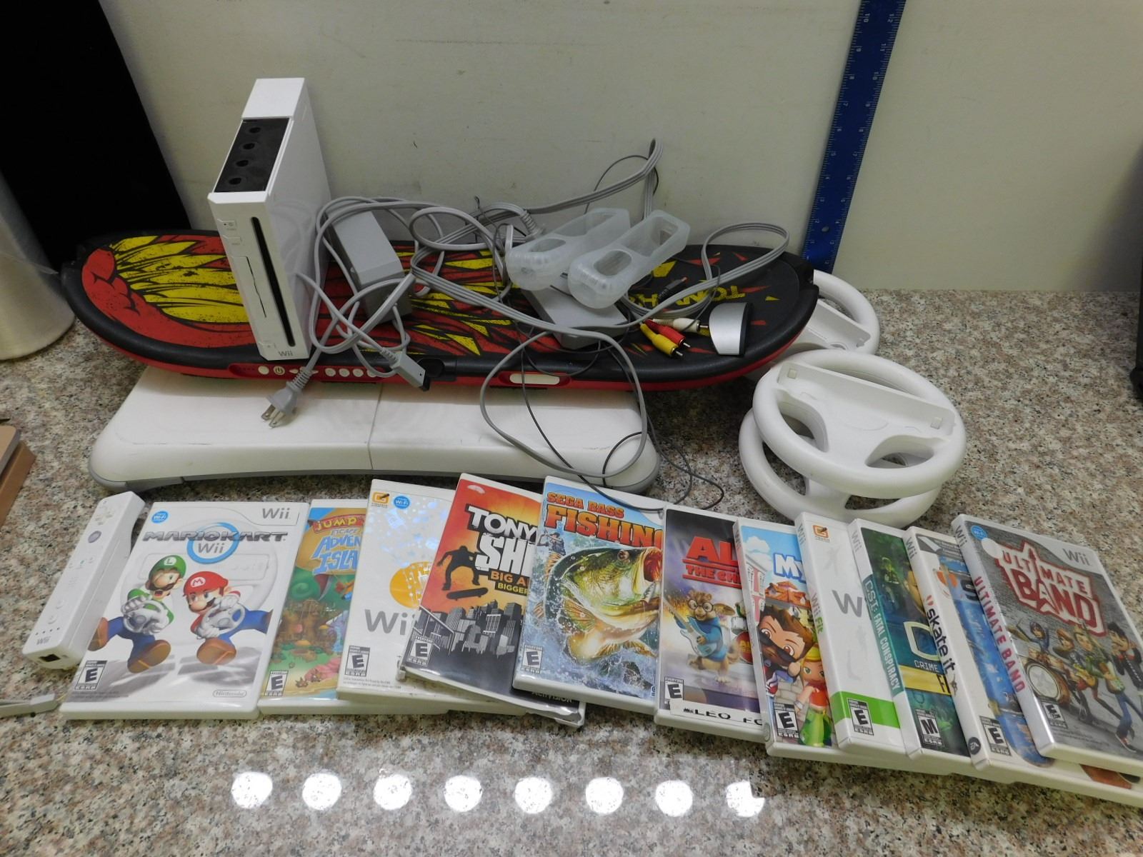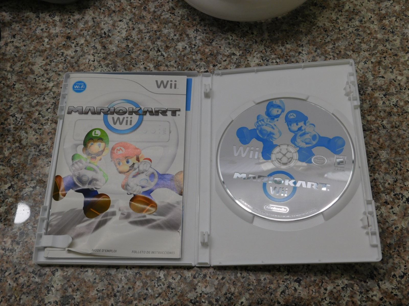backwards compatible model. missing top cover. Includes 1 Wii Mote, 11 games, 3 wheels, 2 grip covers, power and video cables, sensor bar.