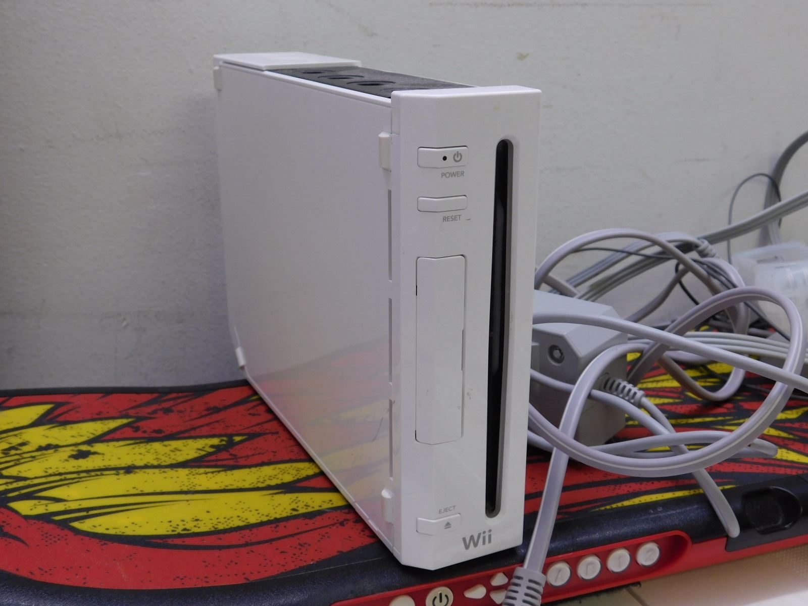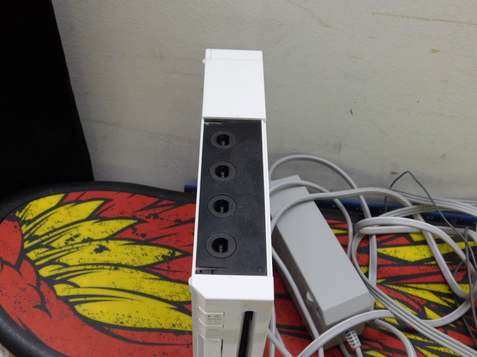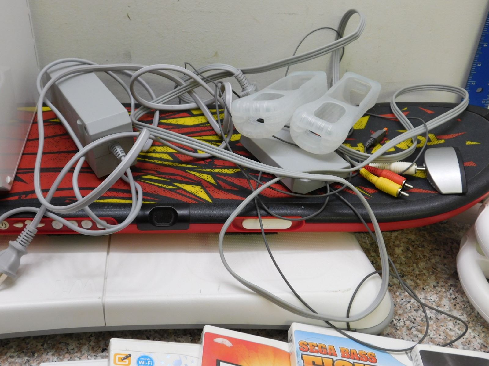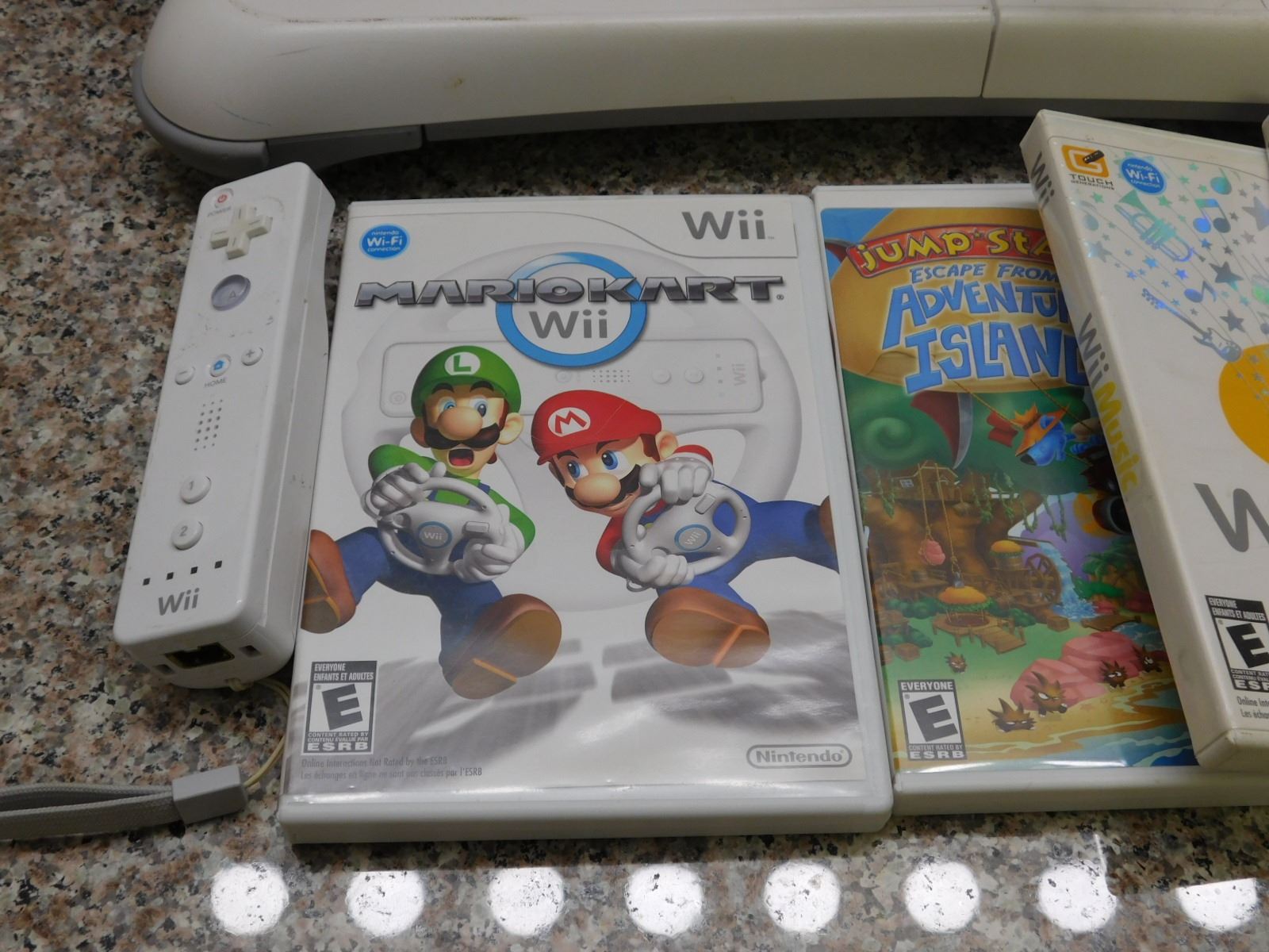 backwards compatible model. missing top cover. Includes 1 Wii Mote, 11 games, 3 wheels, 2 grip covers, power and video cables, sensor bar.