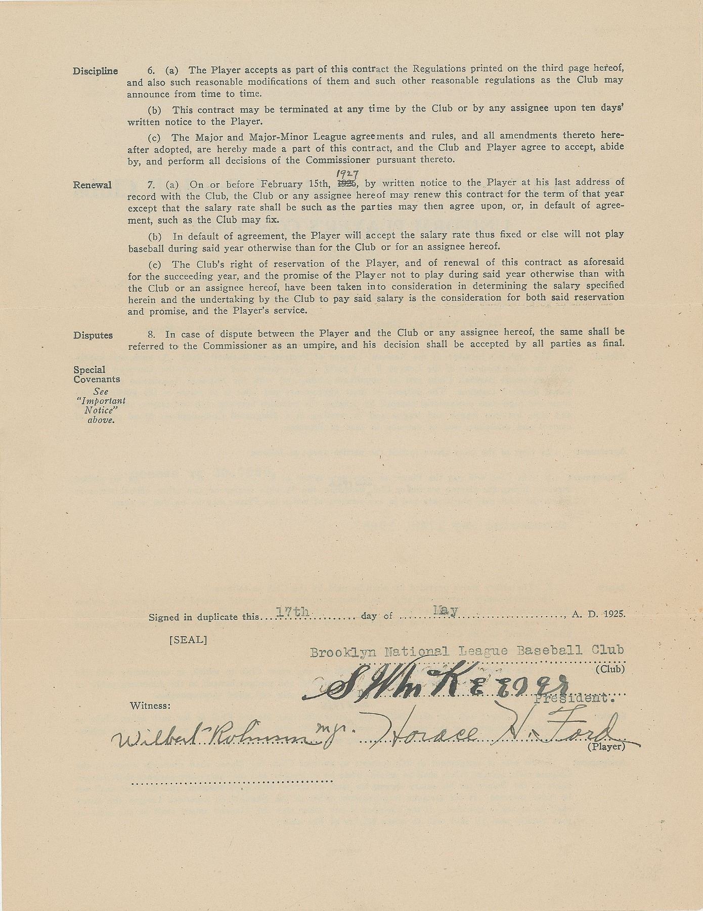 Contract, signed “Wilbert Robinson, Jr.,” and “Horace H. Ford,” four pages on two adjoining sheets, 8.5 x 11, May 17, 1925. National League uniform player's contract in which Horace 'Hod' Ford agrees to render "skilled services during the playing seasons of 1925 and 1926" for the Brooklyn Robins, for an aggregate salary of $6,500 per season. Signed at the conclusion in fountain pen by both Robinson and Ford, and countersigned by Robins owner and president Stephen McKeever. In fine condition.
