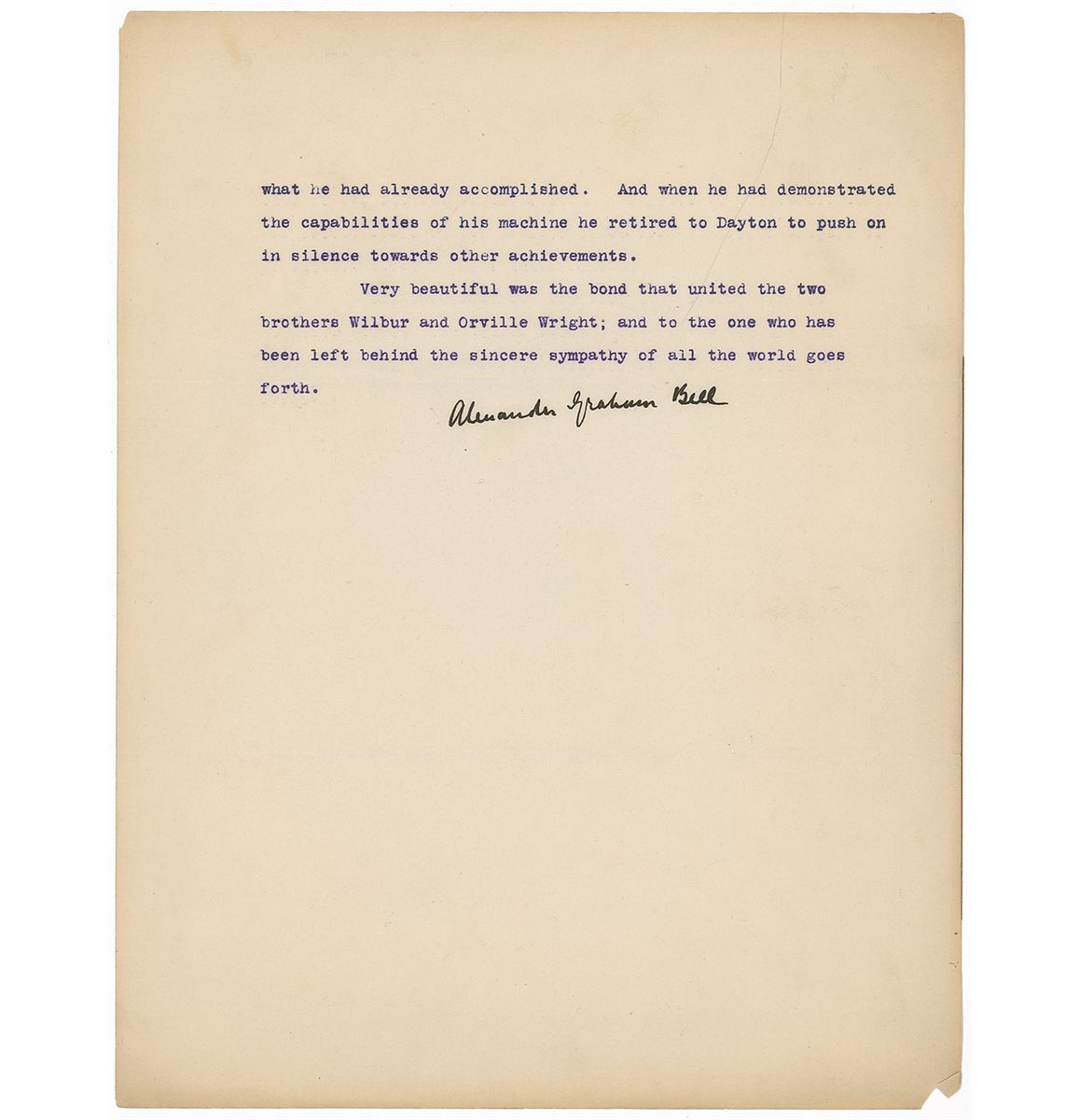Typed manuscript, signed “Alexander Graham Bell,” two pages, 8.5 x 11, personal letterhead, no date [June, 1912]. In full: “In the untimely death of Wilbur Wright the world loses a very remarkable man. While I have met him a number of times, our acquaintance was of the most superficial character; and my knowledge of his work is only such as could be gleaned from the public press. He, however, impressed me as a man of great force and indomitable will—silent, purposeful and valuing achievement more than fame.