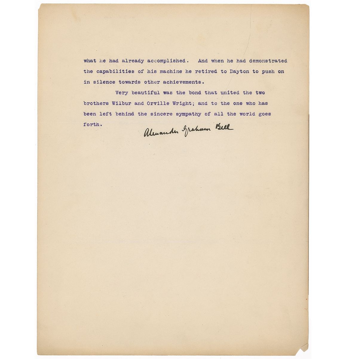 Typed manuscript, signed “Alexander Graham Bell,” two pages, 8.5 x 11, personal letterhead, no date [June, 1912]. In full: “In the untimely death of Wilbur Wright the world loses a very remarkable man. While I have met him a number of times, our acquaintance was of the most superficial character; and my knowledge of his work is only such as could be gleaned from the public press. He, however, impressed me as a man of great force and indomitable will—silent, purposeful and valuing achievement more than fame.